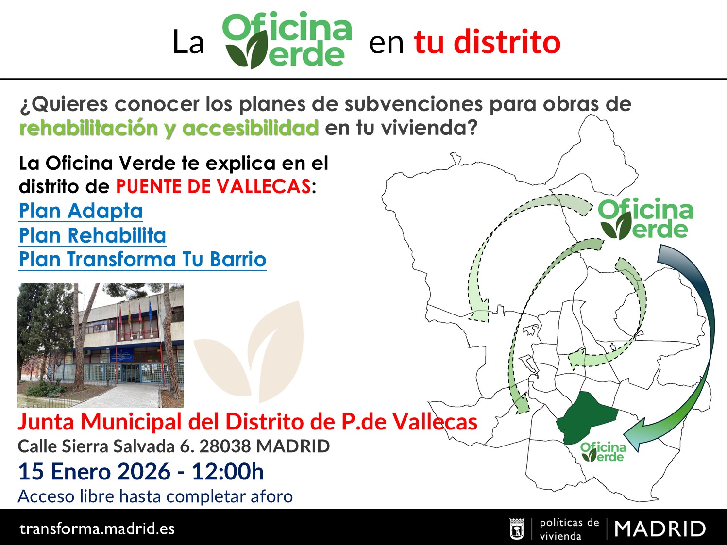 2026.01.15_Jornada "La Oficina Verde en tu Distrito" en el Distrito de Puente de VallecasSi quieres conocer los planes de subvenciones para obras de rehabilitación y accesibilidad en tu vivienda, le informamos que la Oficina Verde realiza Jornadas Informativas en los distritos sobre los Planes Adapta, Rehabilita y Transforma tu Barrio. -