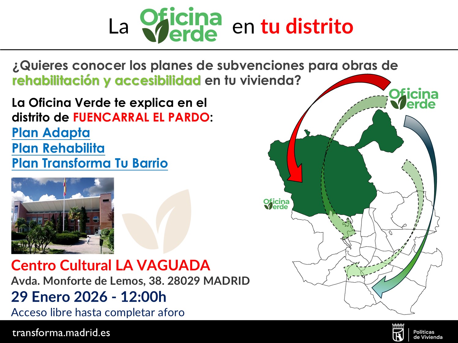 2026.01.29_Jornada "La Oficina Verde en tu Distrito" en el Distrito de Fuencarral-El PardoSi quieres conocer los planes de subvenciones para obras de rehabilitación y accesibilidad en tu vivienda, le informamos que la Oficina Verde realiza Jornadas Informativas en los distritos sobre los Planes Adapta, Rehabilita y Transforma tu Barrio. -