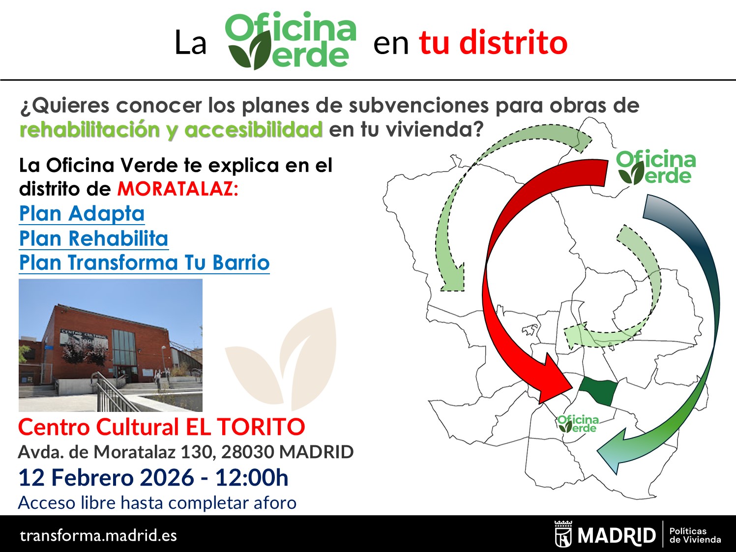 2026.02.12_Jornada "La Oficina Verde en tu Distrito" en el Distrito de MoratalazSi quieres conocer los planes de subvenciones para obras de rehabilitación y accesibilidad en tu vivienda, le informamos que la Oficina Verde realiza Jornadas Informativas en los distritos sobre los Planes Adapta, Rehabilita y Transforma tu Barrio. -