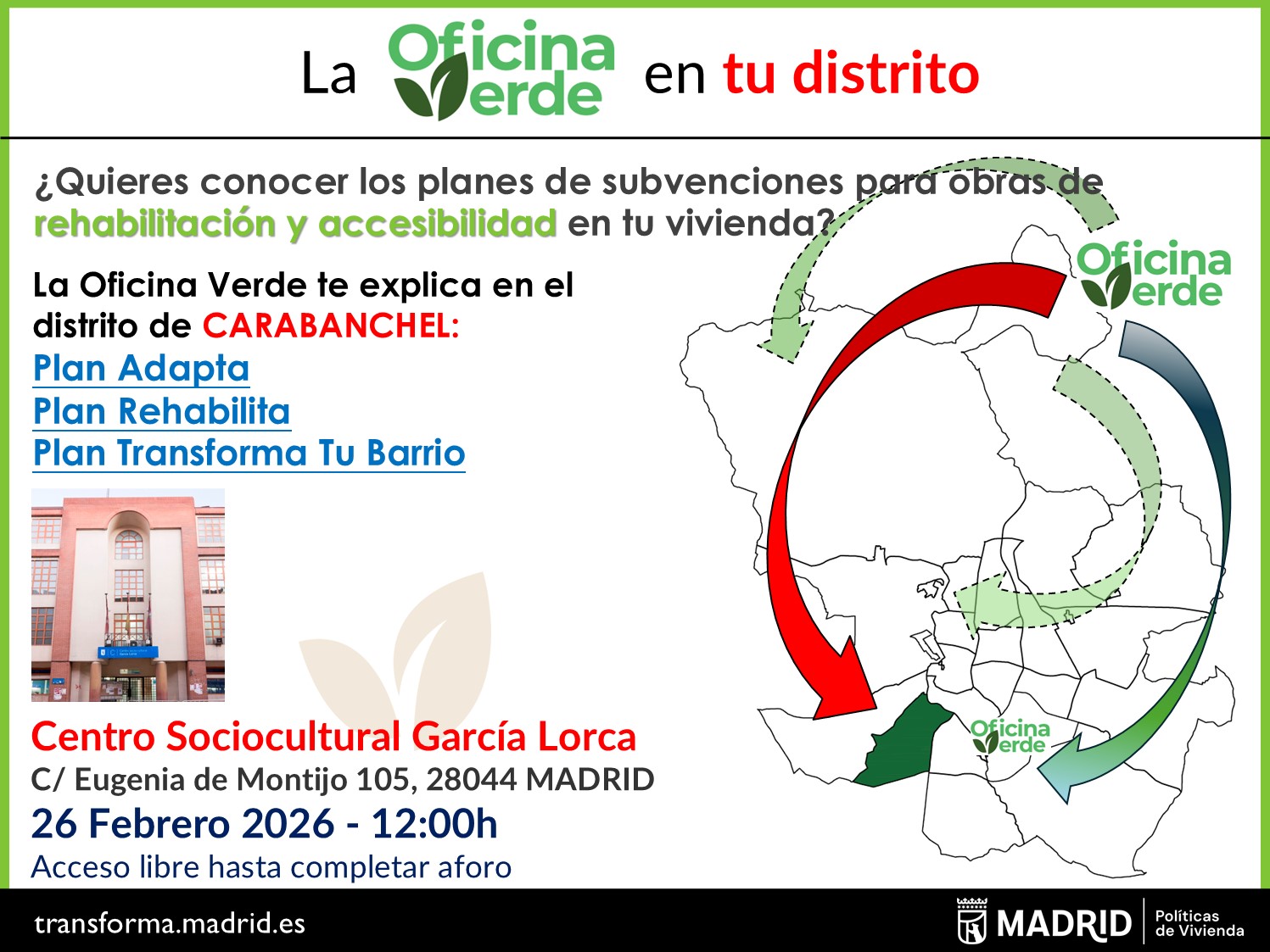 2026.02.26_Jornada "La Oficina Verde en tu Distrito" en el Distrito de CarabanchelSi quieres conocer los planes de subvenciones para obras de rehabilitación y accesibilidad en tu vivienda, le informamos que la Oficina Verde realiza Jornadas Informativas en los distritos sobre los Planes Adapta, Rehabilita y Transforma tu Barrio. -