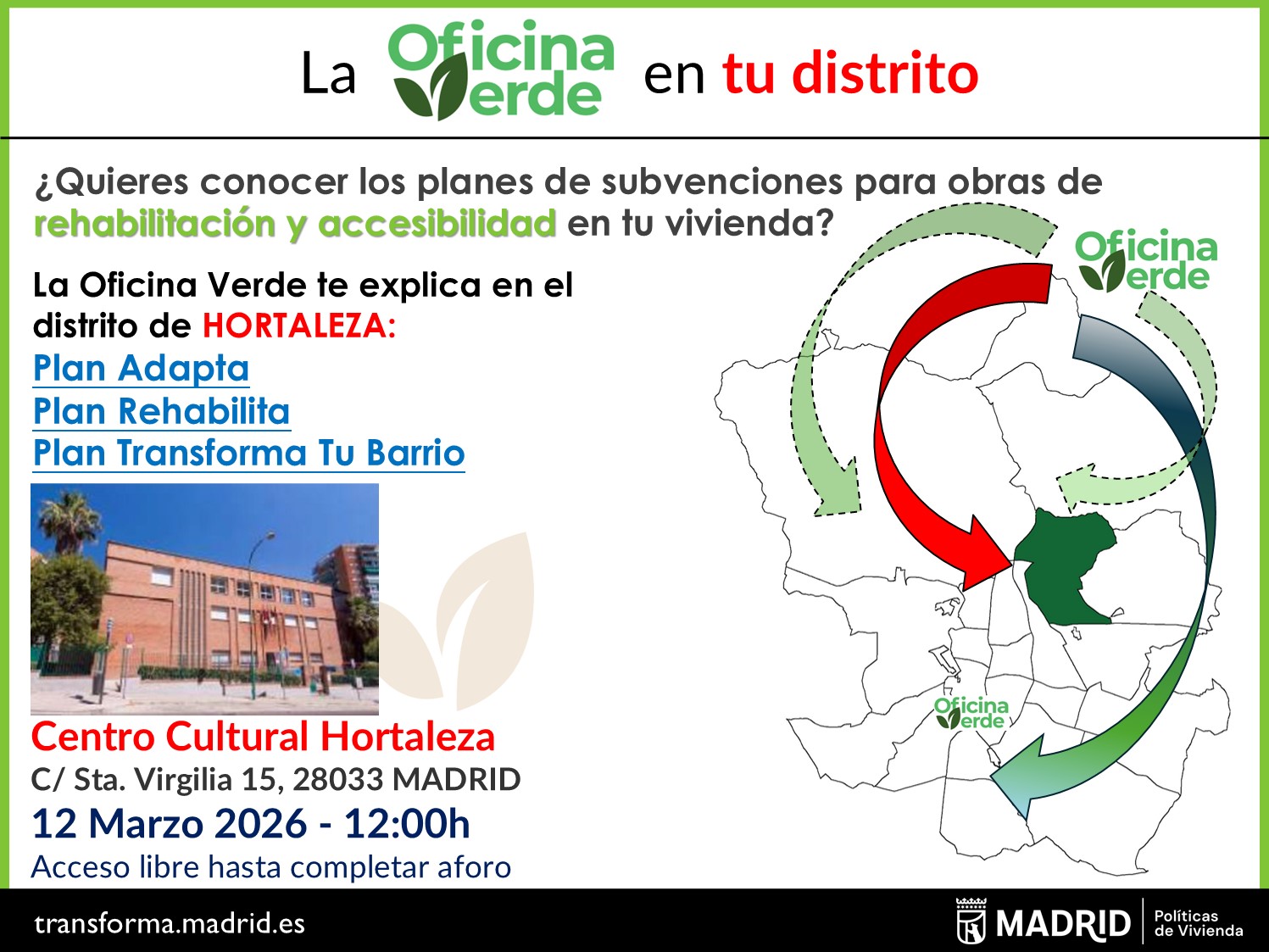 2026.03.12_Jornada "La Oficina Verde en tu Distrito" en el Distrito de HortalezaSi quieres conocer los planes de subvenciones para obras de rehabilitación y accesibilidad en tu vivienda, le informamos que la Oficina Verde realiza Jornadas Informativas en los distritos sobre los Planes Adapta, Rehabilita y Transforma tu Barrio. -