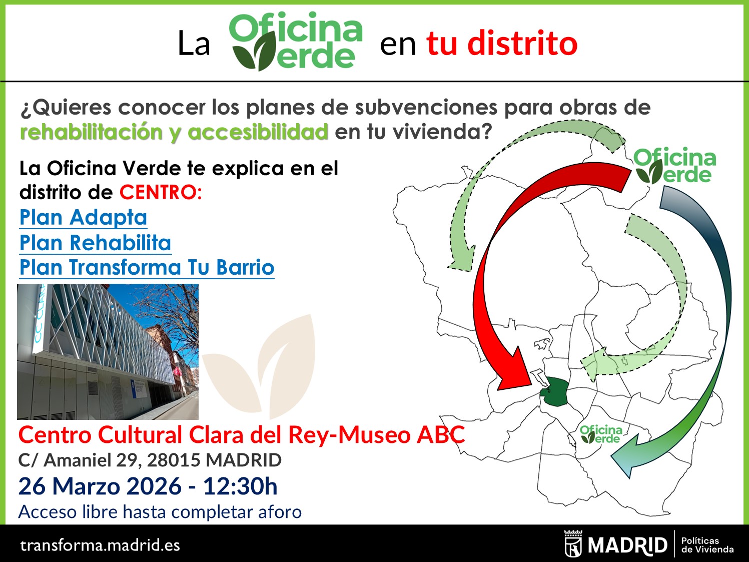 2026.03.26_Jornada "La Oficina Verde en tu Distrito" en el Distrito de CentroSi quieres conocer los planes de subvenciones para obras de rehabilitación y accesibilidad en tu vivienda, le informamos que la Oficina Verde realiza Jornadas Informativas en los distritos sobre los Planes Adapta, Rehabilita y Transforma tu Barrio. -