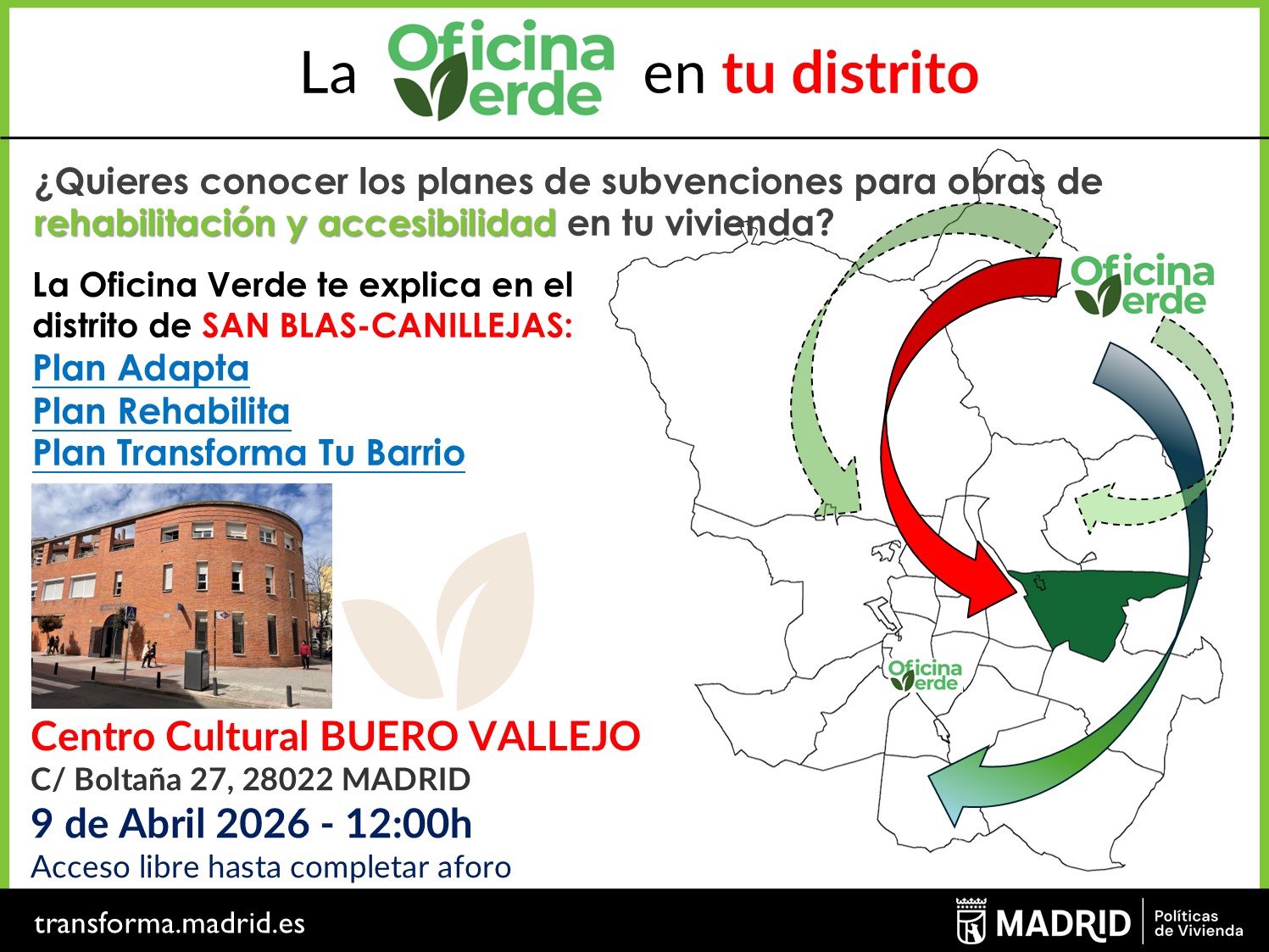 2026.04.09_Jornada "La Oficina Verde en tu Distrito" en el Distrito de San Blas-CanillejasSi quieres conocer los planes de subvenciones para obras de rehabilitación y accesibilidad en tu vivienda, le informamos que la Oficina Verde realiza Jornadas Informativas en los distritos sobre los Planes Adapta, Rehabilita y Transforma tu Barrio. -