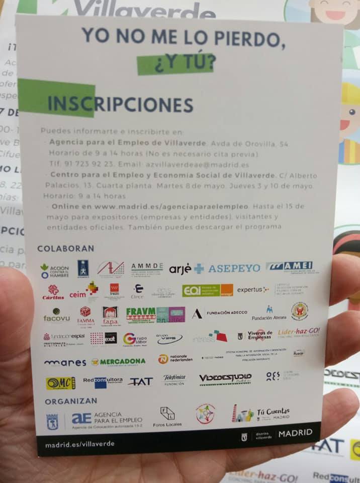 La I Feria de Empleo de Villaverde, que organiza la Junta Municipal de Villaverde, la Agencia para el Empleo del Ayuntamiento de Madrid, la consejería de educación de la Comunidad de Madrid, y diversas entidades de la Mesa Técnica de Empleo de Villaverde, la Mesa de Empleo del Foro y otros recursos especializados en empleo, se convertirá en un espacio de oportunidades al servir de punto de encuentro entre empresas y personas que se hallan en búsqueda de empleo o quieran reorientar su carrera profesional.