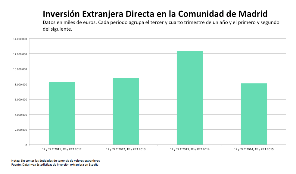 Aunque los datos oficiales del Registro de Inversiones Exteriores se refieren a la IED recibida por la Comunidad de Madrid (no están desglosados por municipios), se estima que entre el 60% y el 80% de las mismas las recibe la capital.