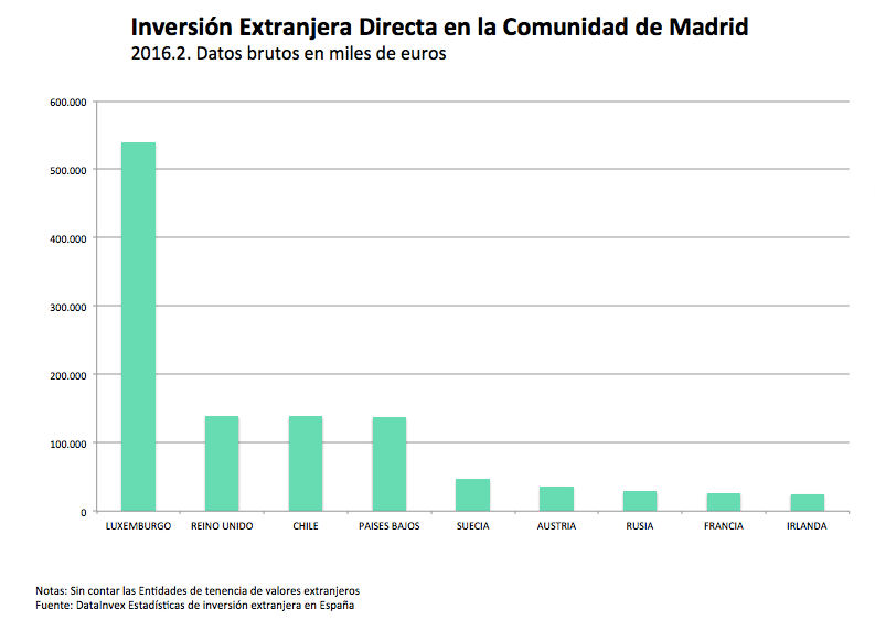 El país de donde más IED ha llegado a Madrid es Luxemburgo, con el 42,2% de todo el flujo recibido, seguido de Reino Unido (10,9%), Chile (10,9%), Países Bajos (10,8%), Suecia (3,7%), Austria (2,9%), Rusia (2,3%), Francia (2,1%) e Irlanda Alemania (2%). La IED procedente del resto de países conforma el restante 12,4%.