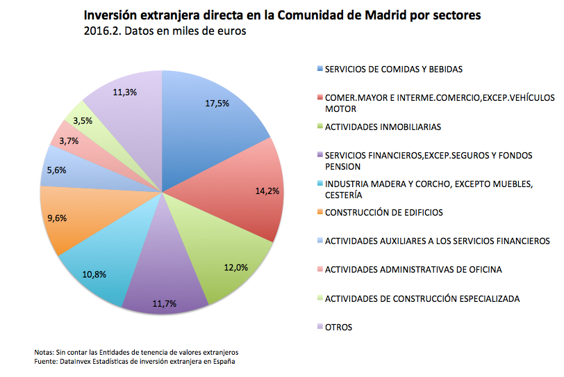 Los sectores en los que se ha concentrado la inversión extranjera directa en el segundo trimestre de 2016 son, por este orden: servicios de comidas y bebidas (con un peso del 17,5%), comercio al por mayor e intermediarios comerciales (14,2%), actividades inmobiliarias (12%), servicios financieros (11,7%), industria de madera y corcho (10,8%) y construcción de edificios (9,6%).