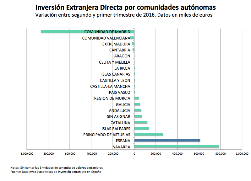 Otras cinco comunidades autónomas han recibido menos IED que el trimestre anterior: Comunidad Valenciana, Extremadura, Cantabria y Aragón, además de las ciudades autónomas Ceuta y Melilla. La comunidad que más ha visto incrementar sus inversiones con respecto al primer trimestre de 2016 ha sido Navarra, que ha experimentado un incremento de 787 millones de euros. El aumento de las IED en Asturias, Baleares, Cataluña, Andalucía, Galicia y Murcia explica que el conjunto de España haya recibido 611 millones de euros más que el trimestre anterior.