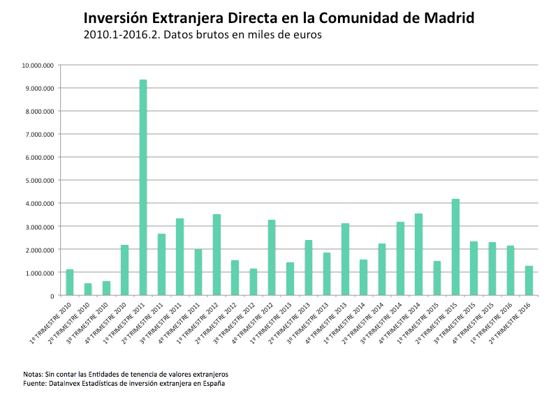 En el segundo trimestre de 2016 la Comunidad de Madrid recibió un flujo de Inversión Extranjera Directa (IED) de 1.279 millones de euros, un 40,3% menos de lo que recibió el trimestre anterior, según las estadísticas del Registro de Inversiones Exteriores (Ministerio de Economía).