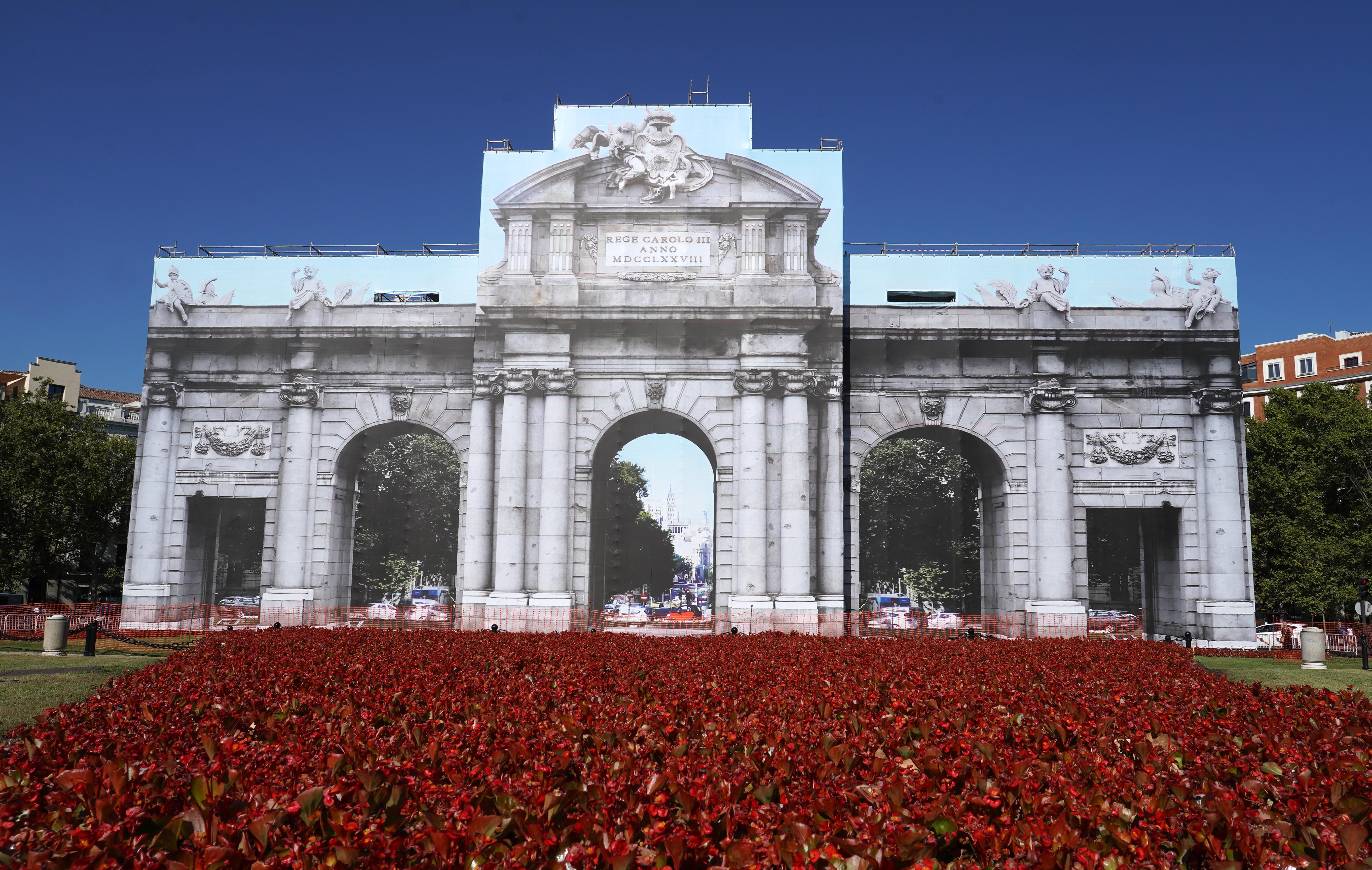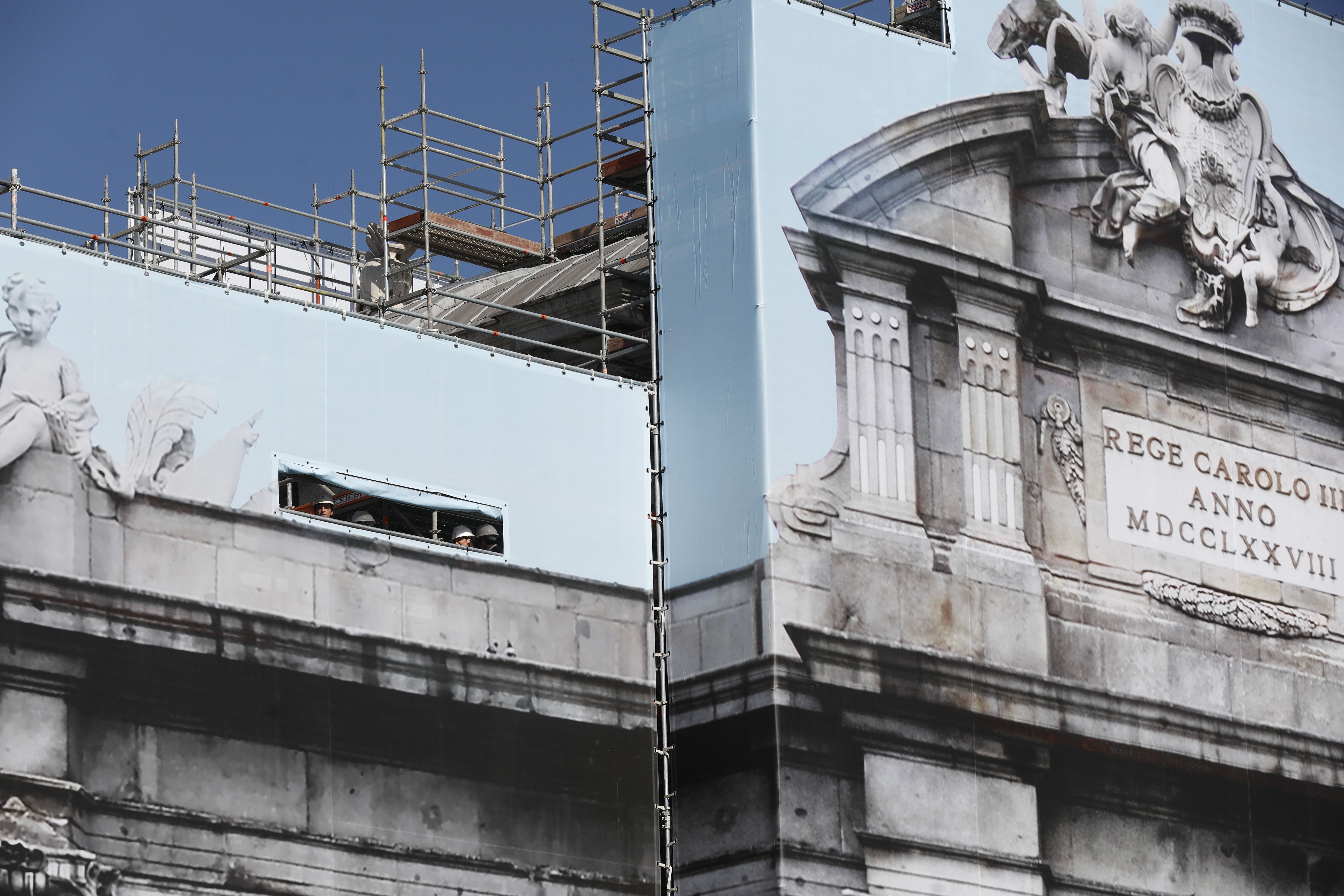 A lo largo de la ejecución de estos trabajos de investigación, promovidos por el Ayuntamiento de Madrid con la colaboración del Instituto del Patrimonio Cultural de España y ejecutados, principalmente, por las empresas Titanio y Fernández Molina, la Puerta quedará cubierta por un andamio protegido por una lona mimética. /