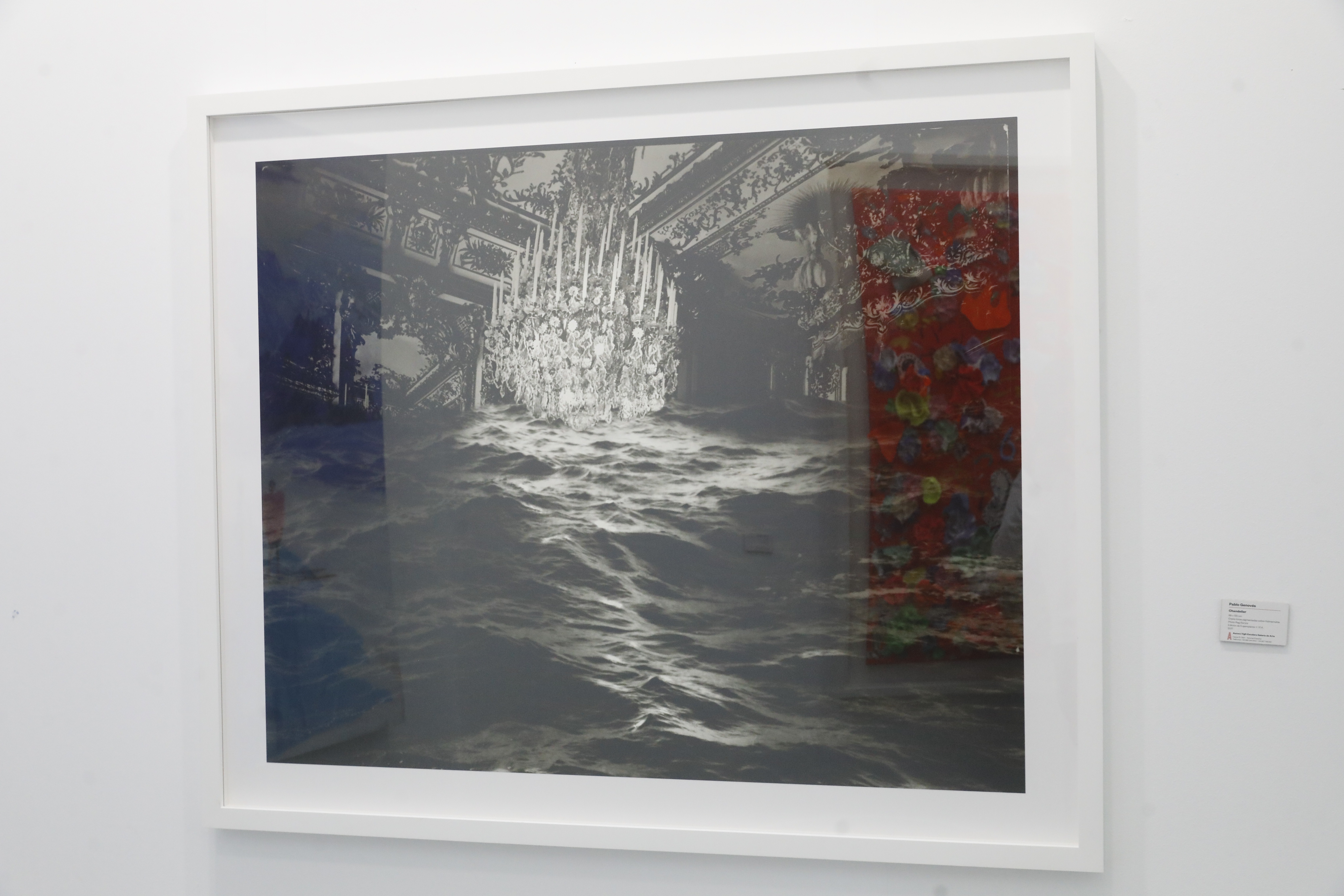 Chandelier de Pablo Genovés, un montaje fotográfico digital impreso en tintas pigmentadas sobre el papel. El artista recurre a las técnicas fotográfico-digitales para crear imágenes cargadas de un furor sublime en las que ríos desbordados, mares embravecidos y oleaje irrumpen en arquitecturas como catedrales, palacios, teatros, bibliotecas o museos. Visualmente impactantes y de gran belleza poética, sus fotografías invitan a la reflexión de quien las contempla.