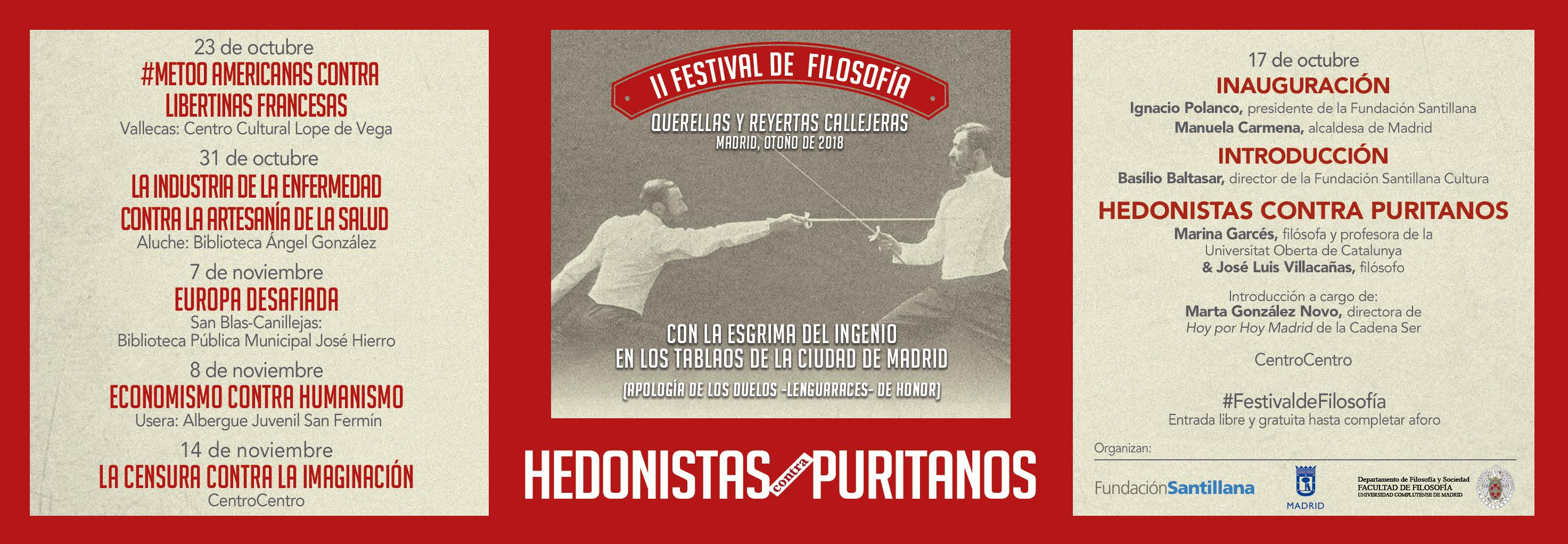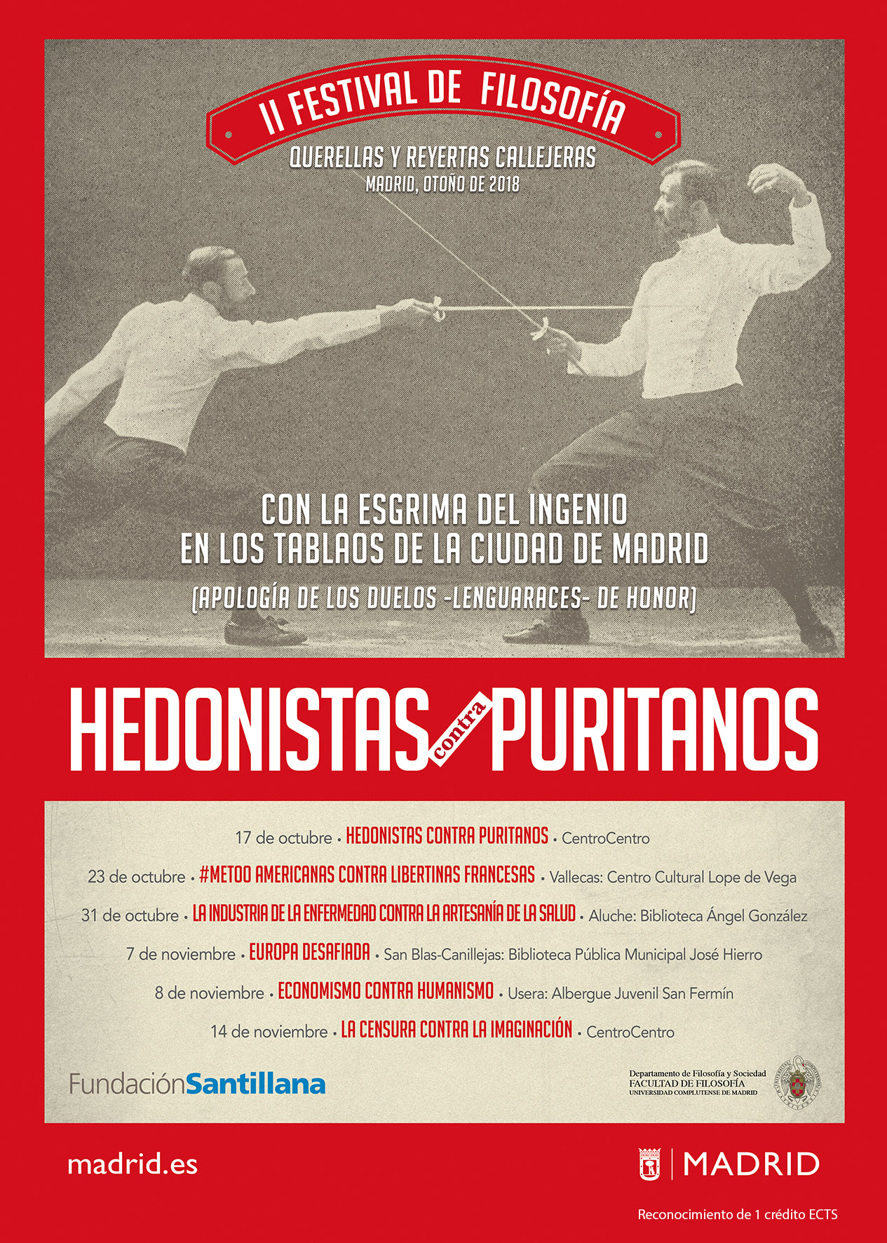 Bajo el título ‘Hedonista contra puritanos’, y con una imagen que propone el arte de la esgrima como modelo de una disputa que no pierde las formas, tendrán lugar seis encuentros que demostrarán que el debate filosófico no es sólo para unos pocos entendidos y que todos los ciudadanos y ciudadanas pueden disfrutar con una conversación que haga pensar.