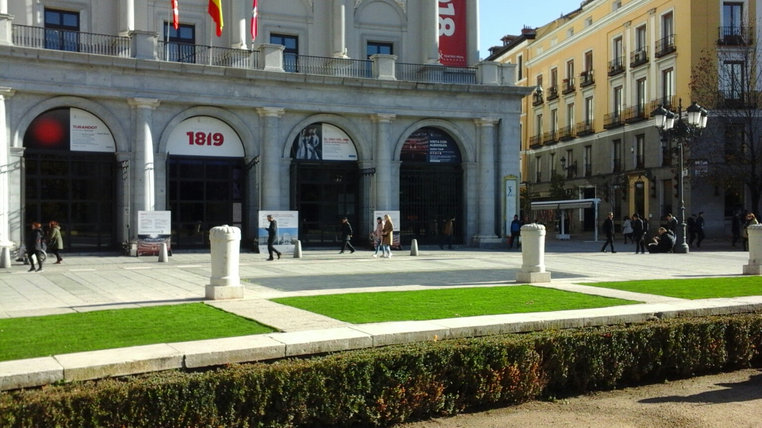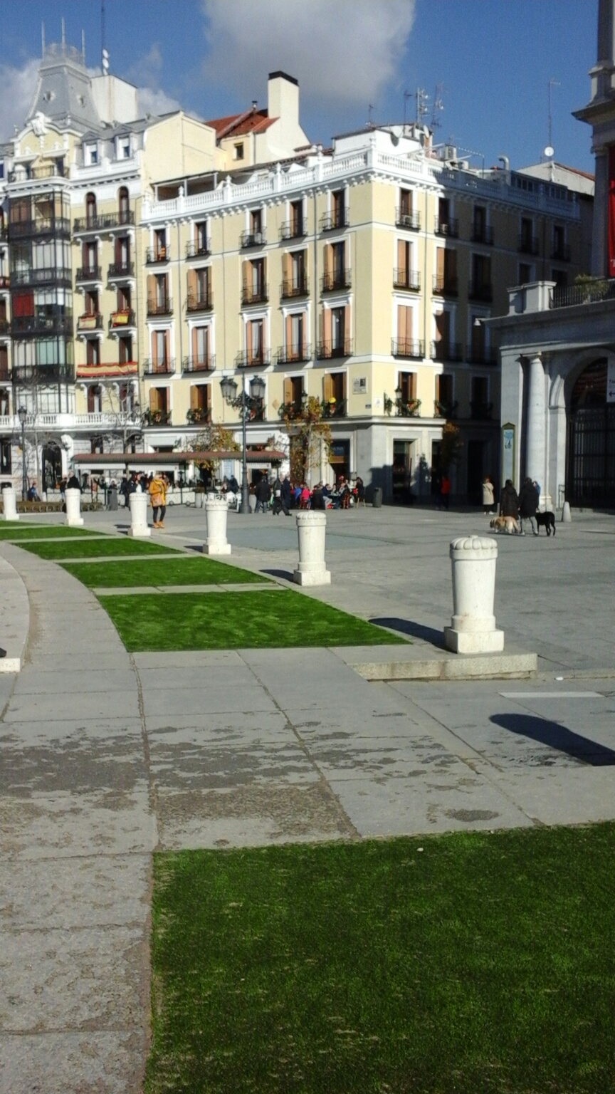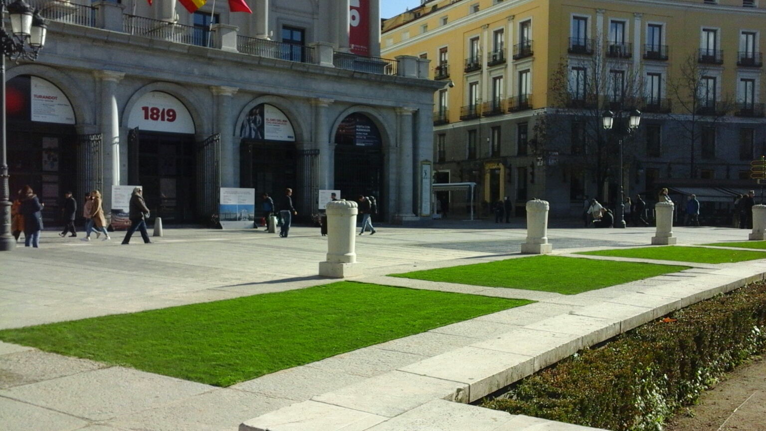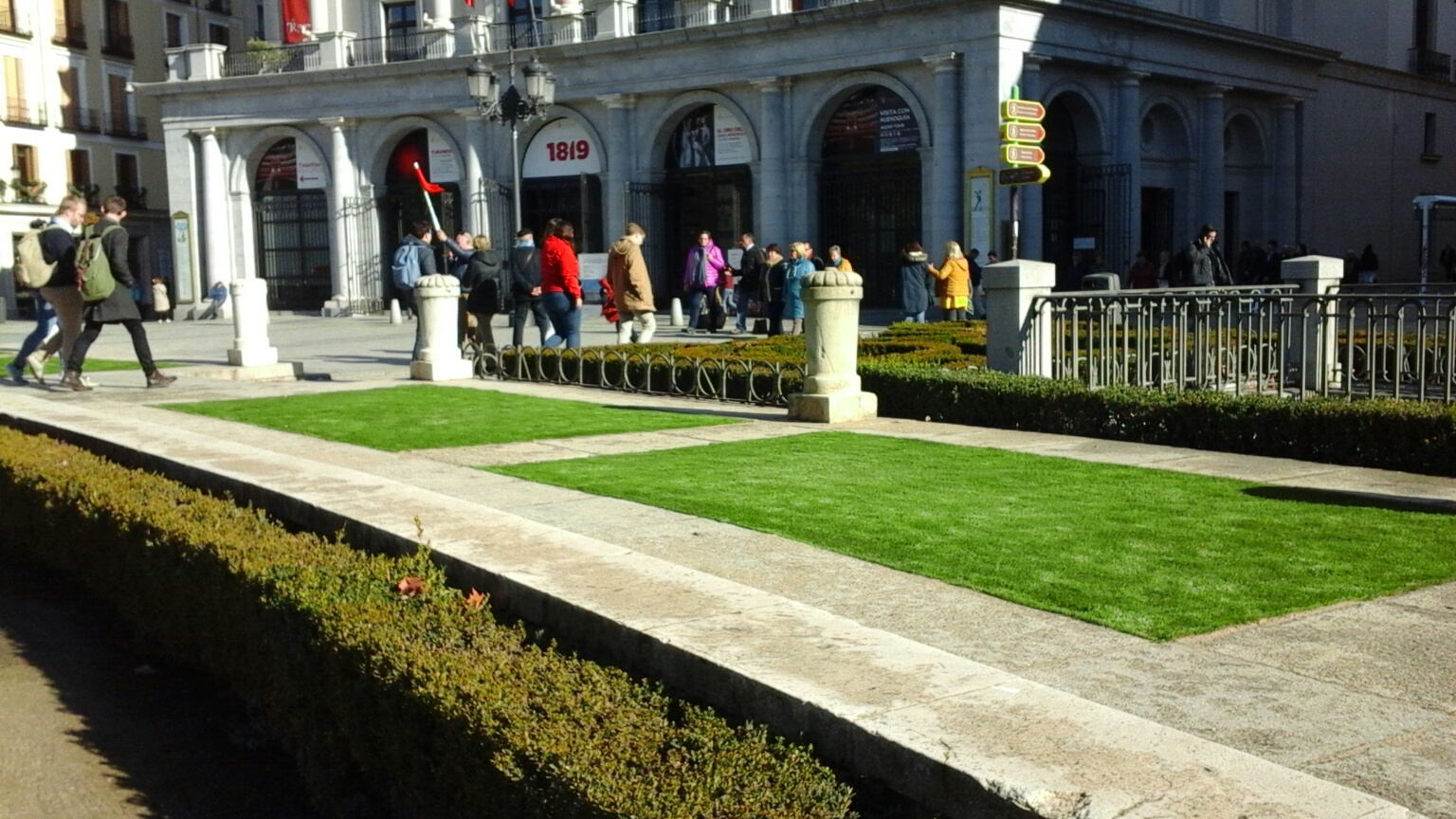 Los parterres de la plaza de Oriente, frente al Teatro Real, lucen por primera vez césped artificial para mostrarse verdes durante todo el invierno. Se trata de una alternativa a las flores de temporada o praderas naturales instaladas otros años y que se estropeaban por la falta de luz natural en la zona.