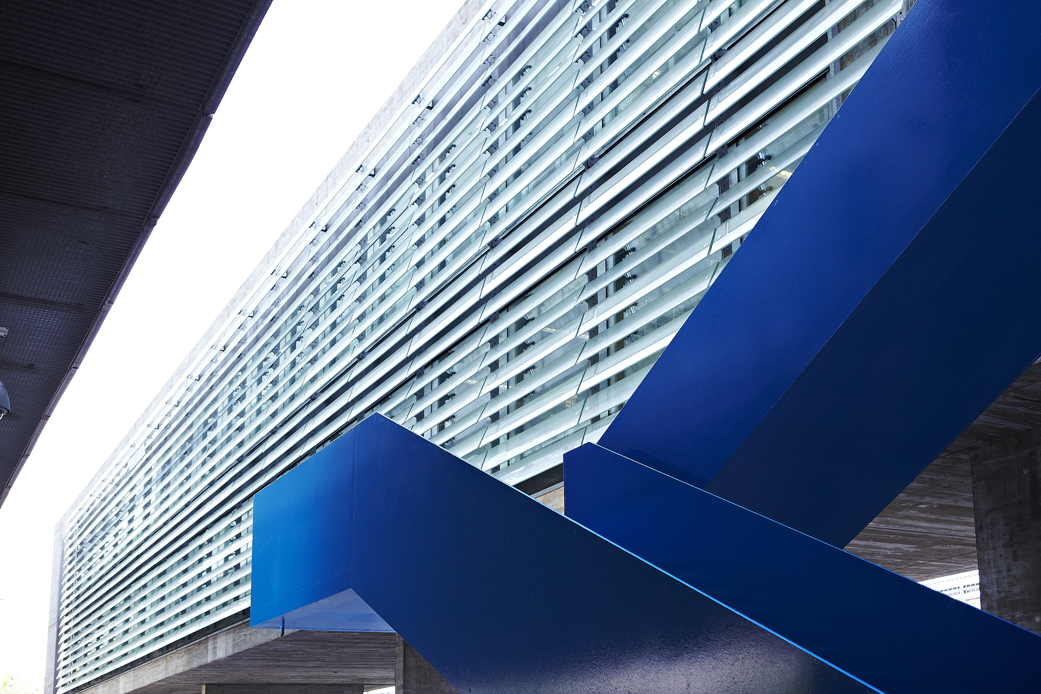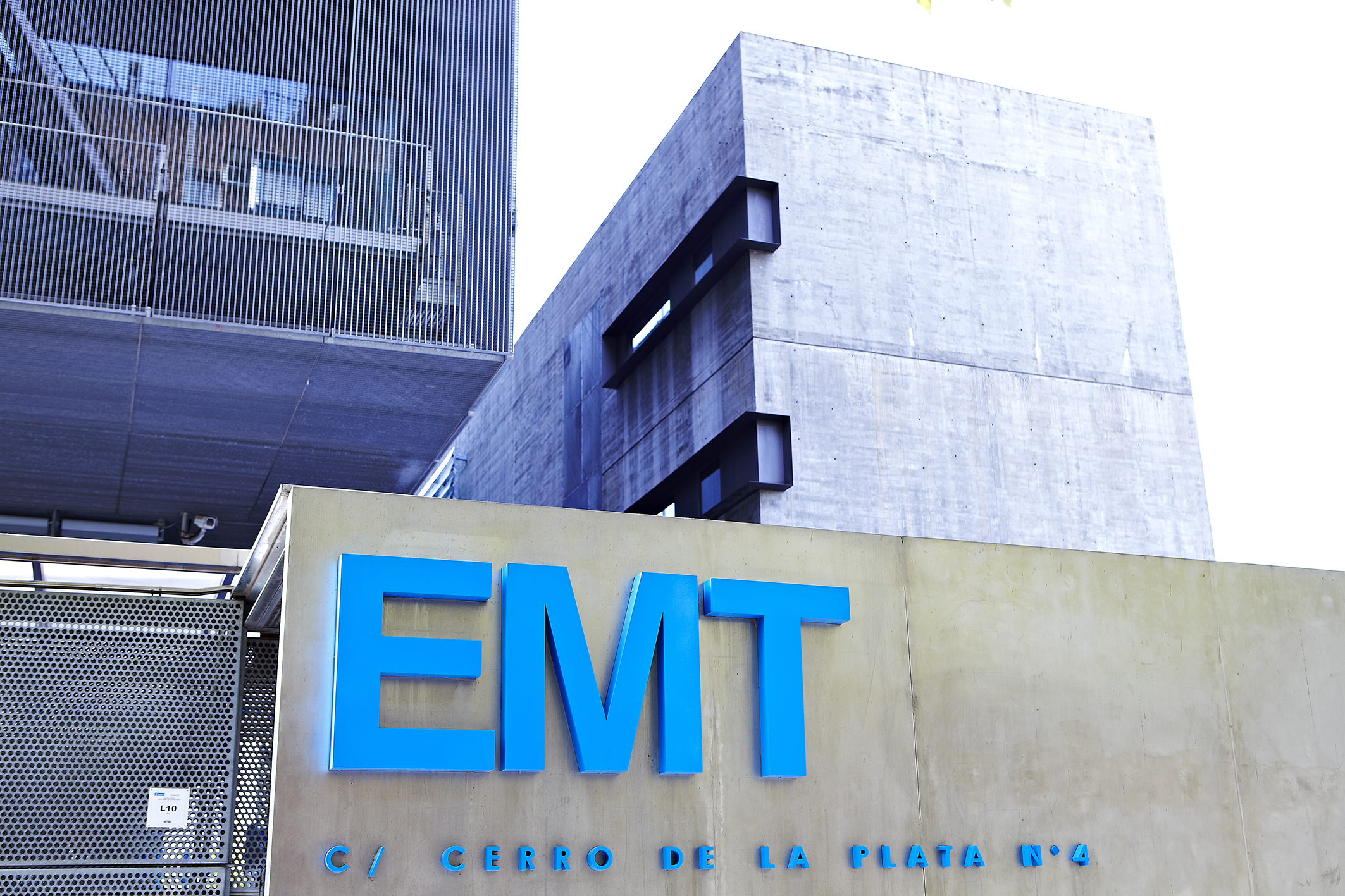 La sede de la EMT está segregada en dos edificios independientes conectados por una arteria, similar a un puente levadizo: el principal, que se plantea como un gran prisma de acero y vidrio, y otro anexo para servicios auxiliares. La particularidad de este complejo es que las cuatro plantas de oficinas cuelgan de dos vigas metálicas dispuestas en direcciones paralelas a las dos fachadas principales y van apoyadas simplemente sobre núcleos de hormigón. Las dos construcciones quedan elevadas sobre el plano del suelo.