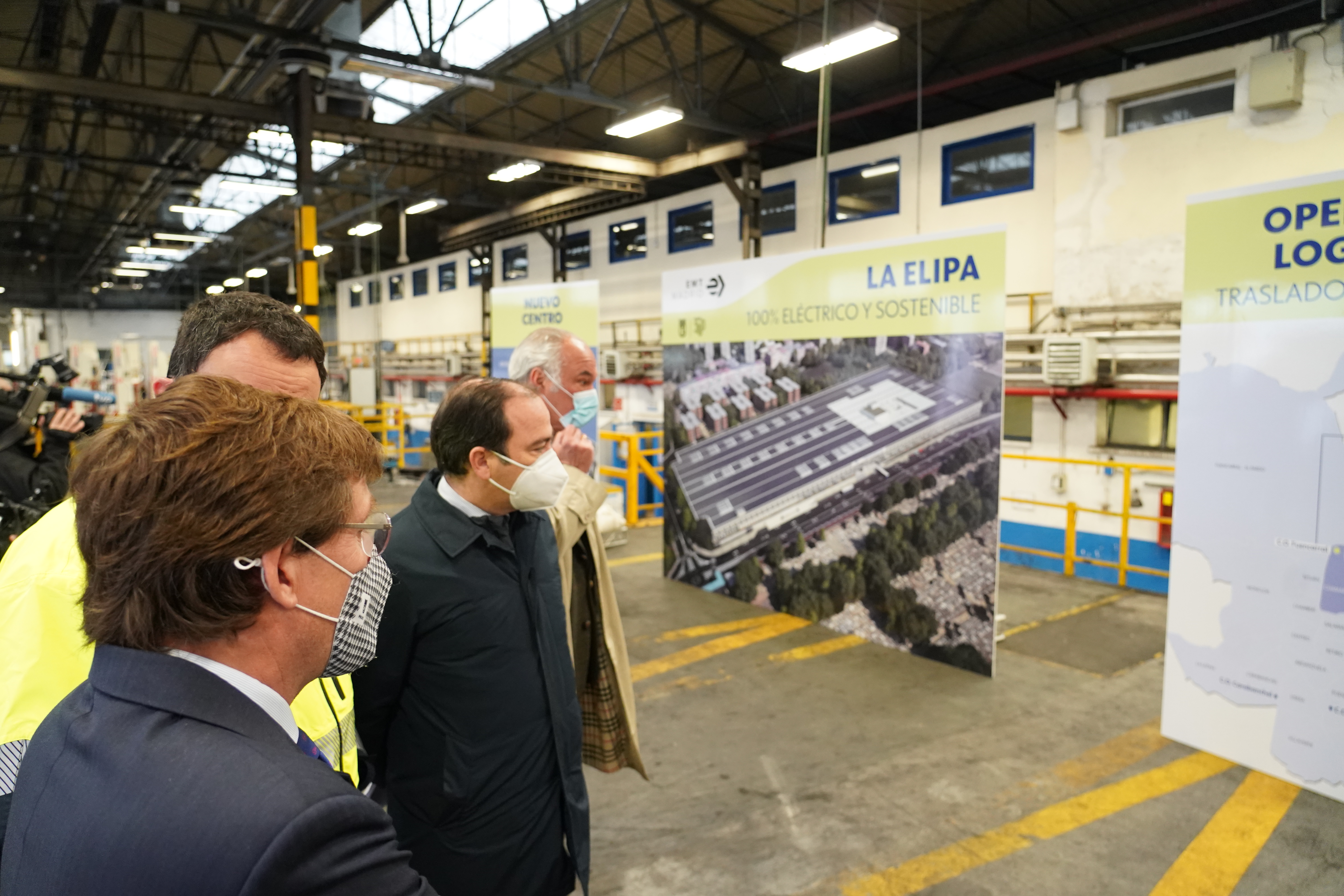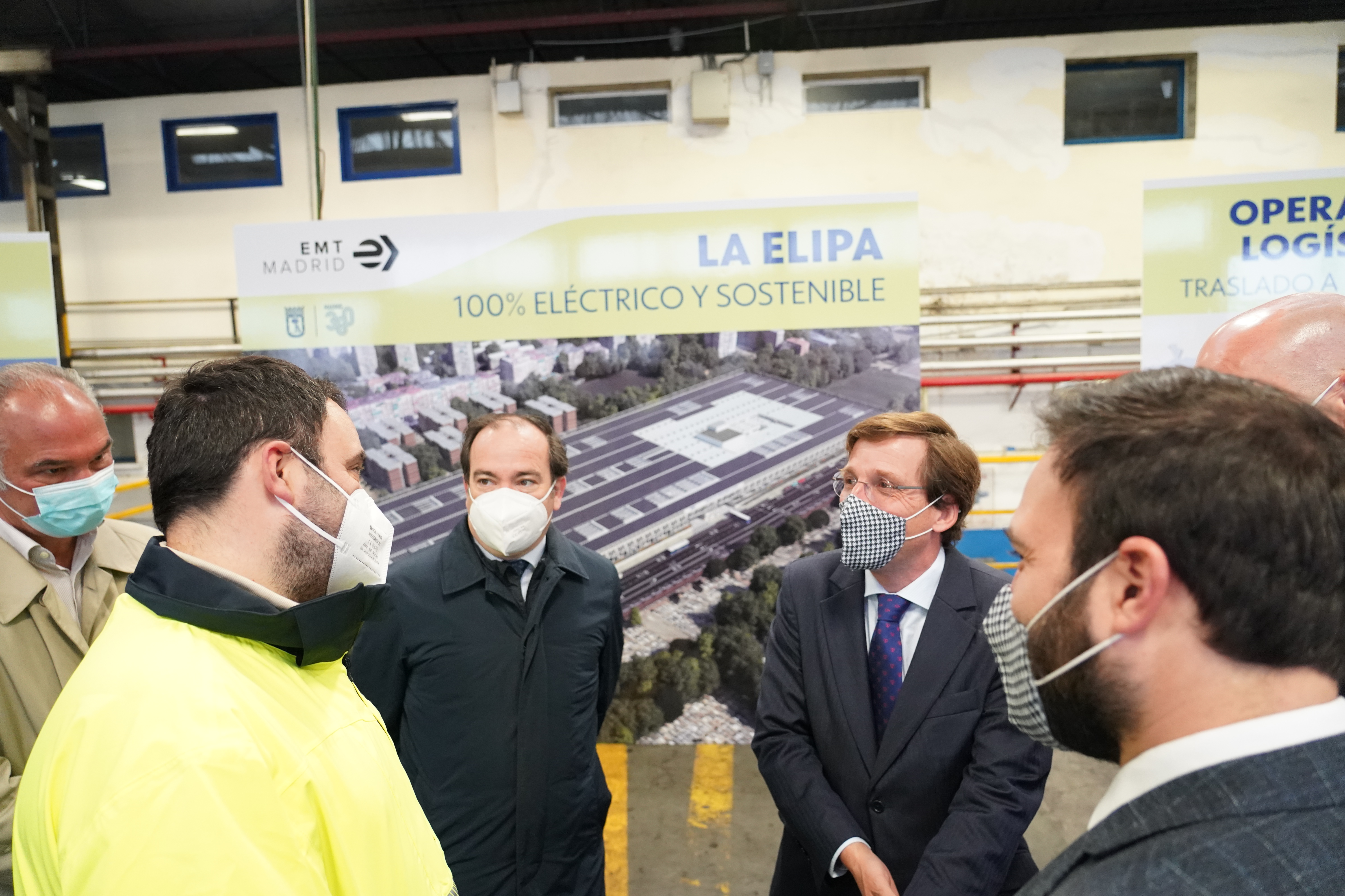 Almeida, acompañado por el delegado de Medio Ambiente y Movilidad, Borja Carabante; el concejal del distrito, Ángel Niño, y el gerente de la EMT, Alfonso Sánchez, ha conocido sobre el terreno un boceto del futuro centro de operaciones y de las nuevas cocheras.