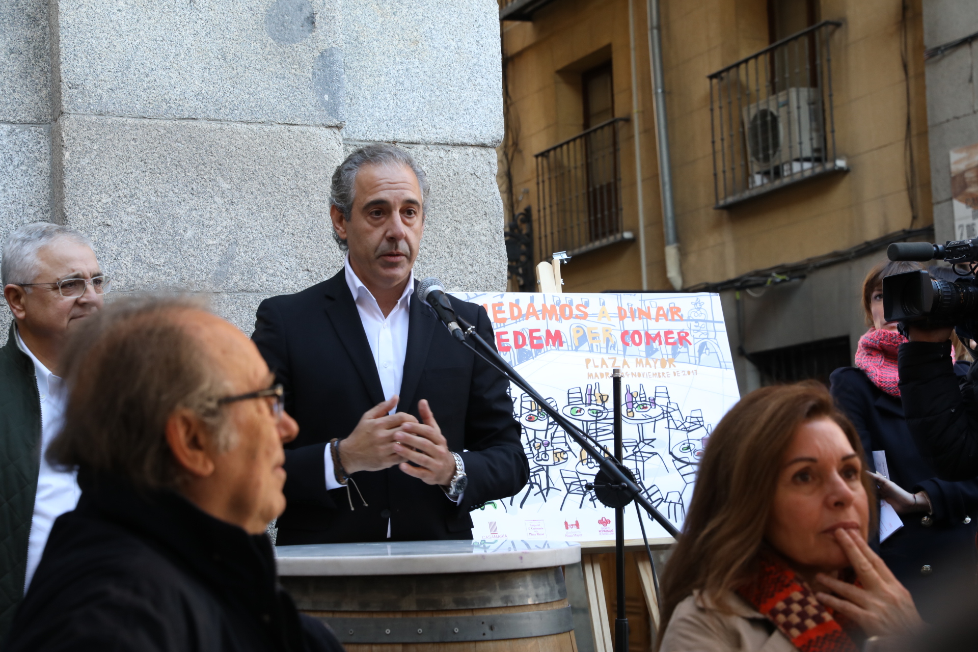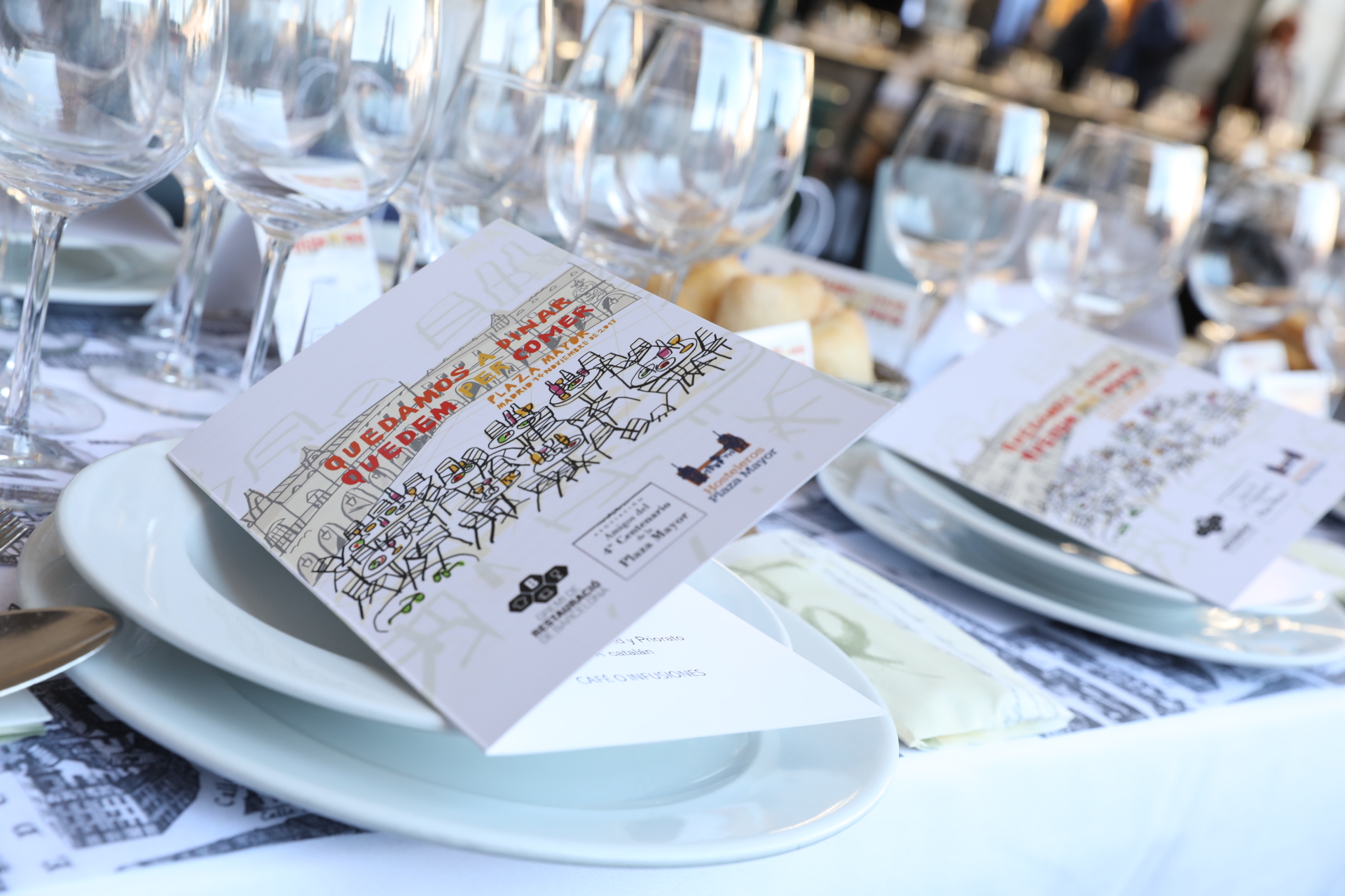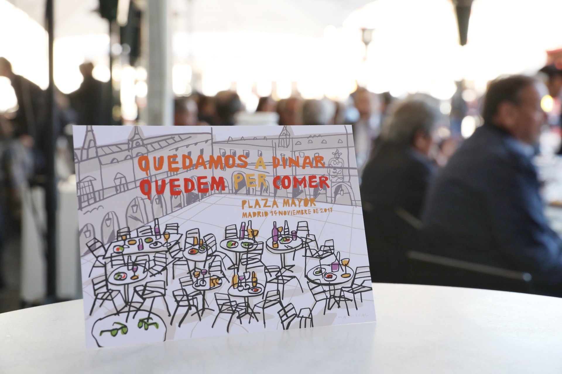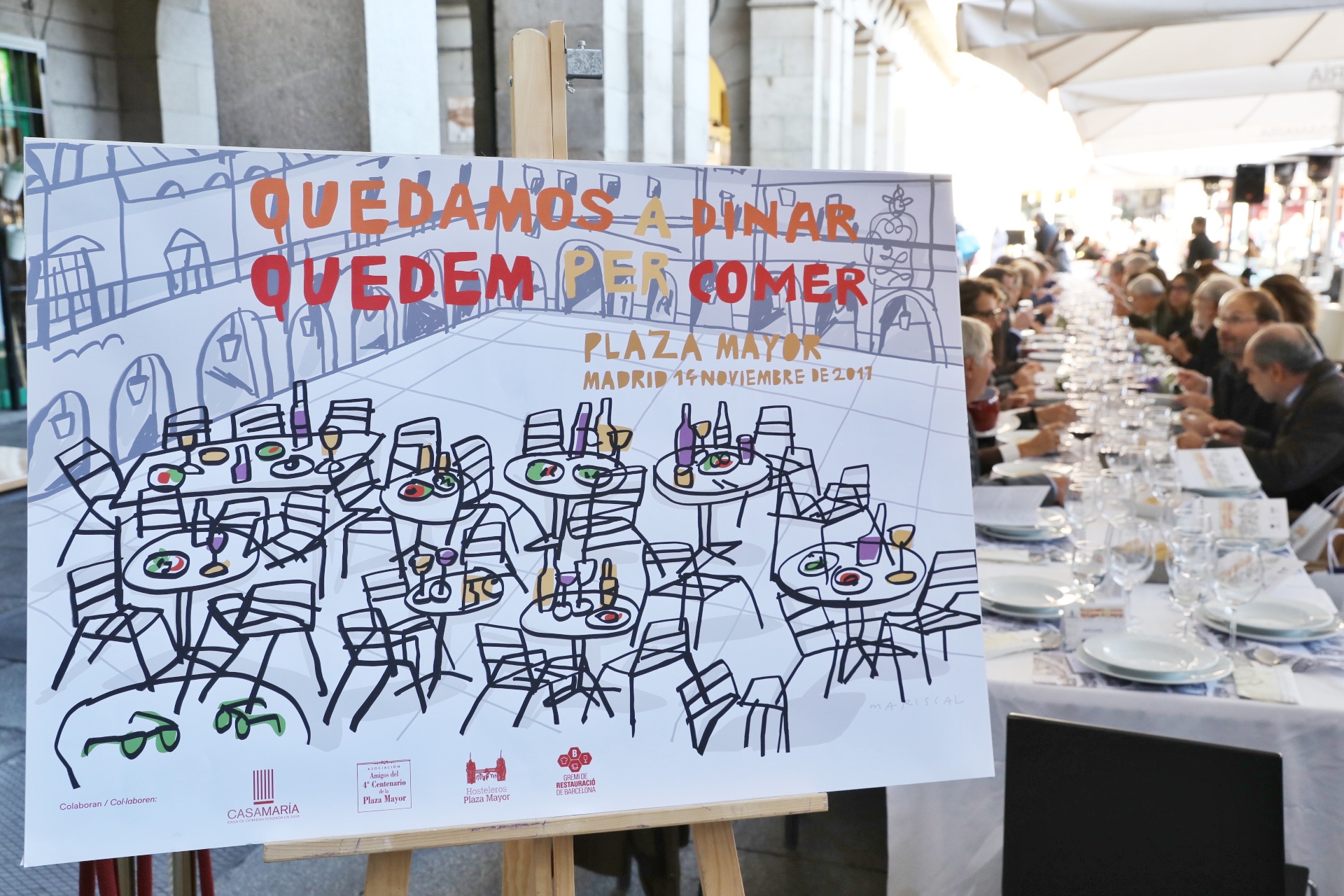 El diálogo siempre fluye en torno a una buena mesa. La Asociación de Amigos del IV Centenario de la Plaza Mayor; la de Hosteleros de la Plaza Mayor y Madrid de los Austrias y el Gremi de Restauració de Barcelona se han unido ante los fogones para maridar en un menú las especialidades de ambas comunidades. El escenario ha sido la terraza de Casa María, uno de los restaurantes que circundan esta plaza que, como señalan los organizadores, “ha sido un escenario del poder, de la cultura urbana y de las luchas por la libertad. Hoy quiere ser escenario de concordia y diálogo en torno a una mesa”. De ahí el lema que, como en el menú, mezcla los dos idiomas: “Quedamos a dinar. Quedem per comer”.
