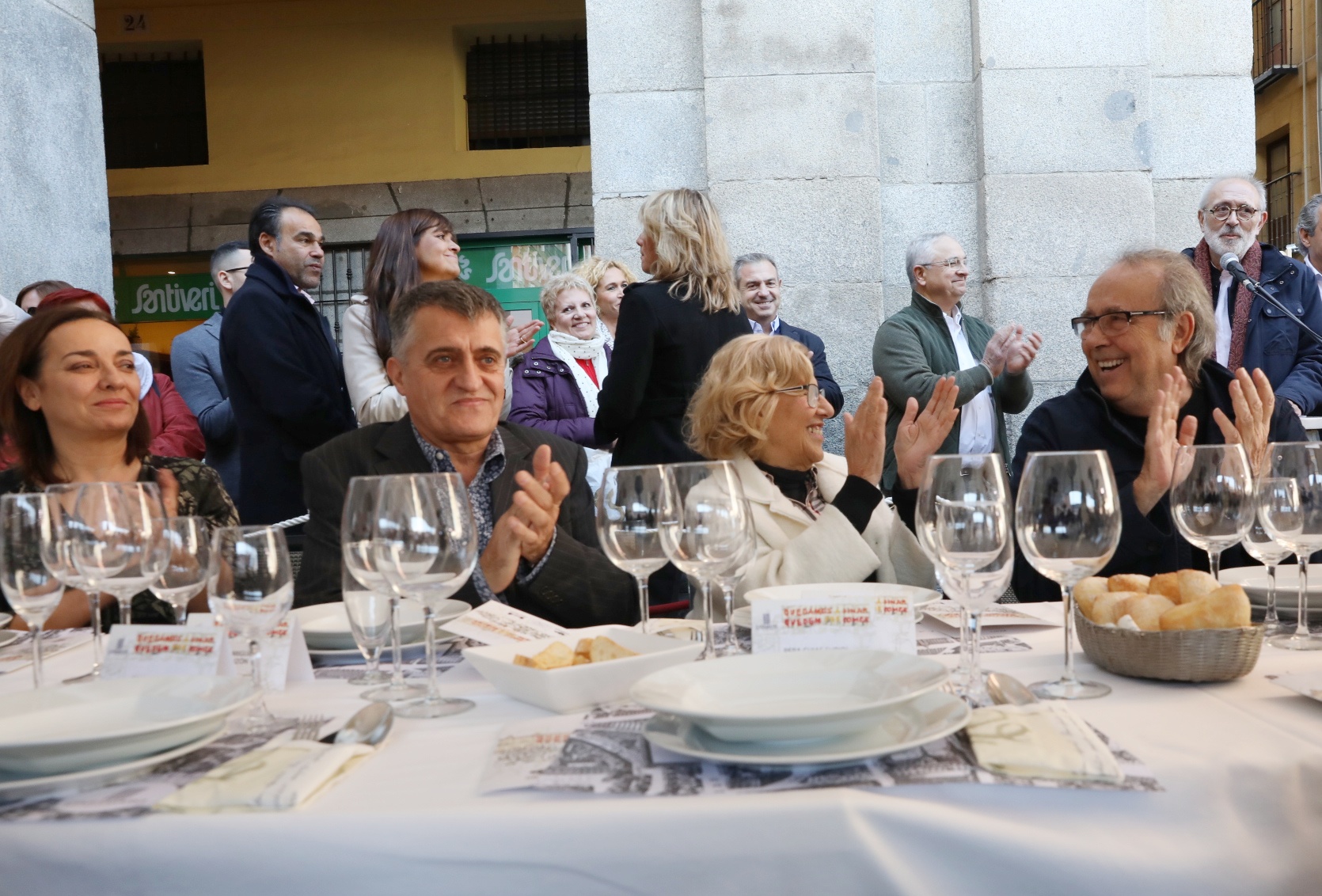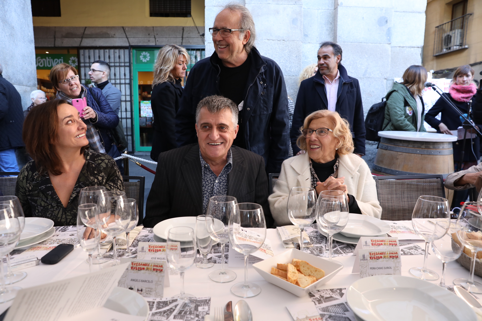 Manuela Carmena, alcaldesa de Madrid, y Marta Higueras, primera teniente de alcalde, han sido dos de los comensales. Junto a ellas, nombres como Joan Manuel Serrat, el gran Wyoming, Cristina Almeida, Juan Barranco, Pepa Bueno, Javier Sardá, Iñaki Gabilondo, Mercedes Milá, Rosana Torres, Unai Sordo, Cándido Méndez y muchos más hasta superar las sesenta personas. Catalanes y madrileños; madrileños y catalanes compartiendo, por ejemplo, una sopa de cocido y una escalibada de primero; un empedrado de garbanzos de Madrid con mongetes amb botifarra y, de postre, leche merengada y crema catalana. Gentes muy diversas que, como dicen los organizados, reflejan que “por eso podemos convivir. Por eso tendremos futuro”./