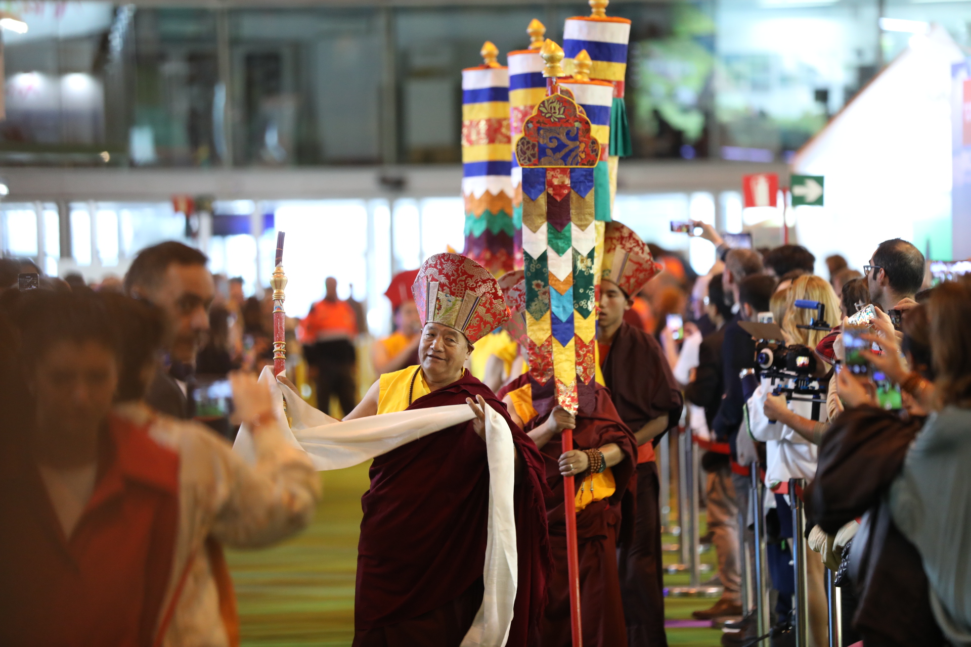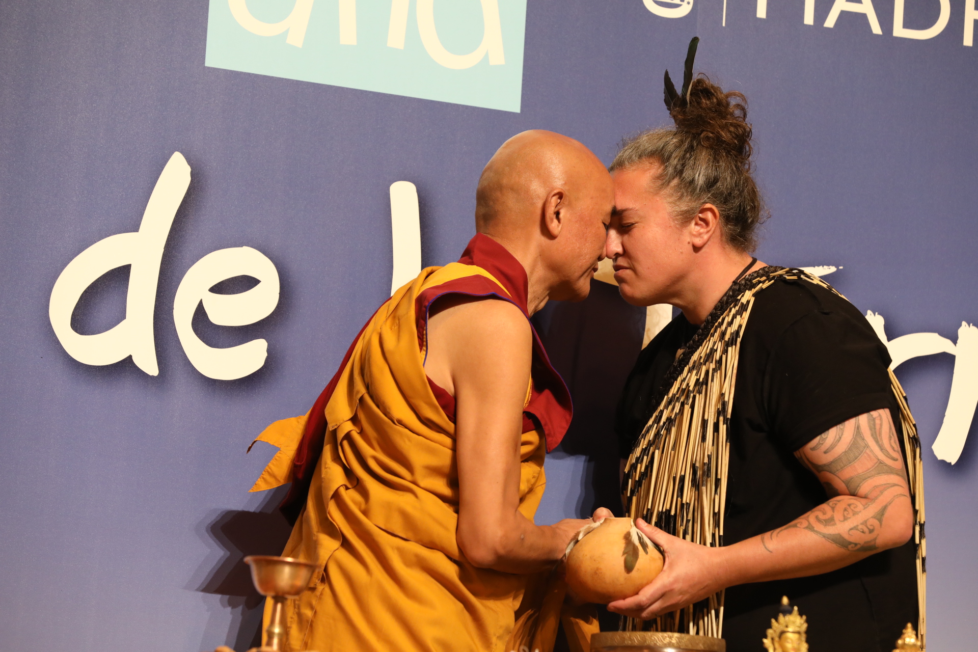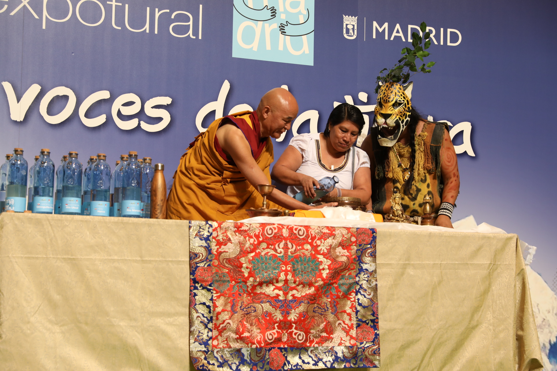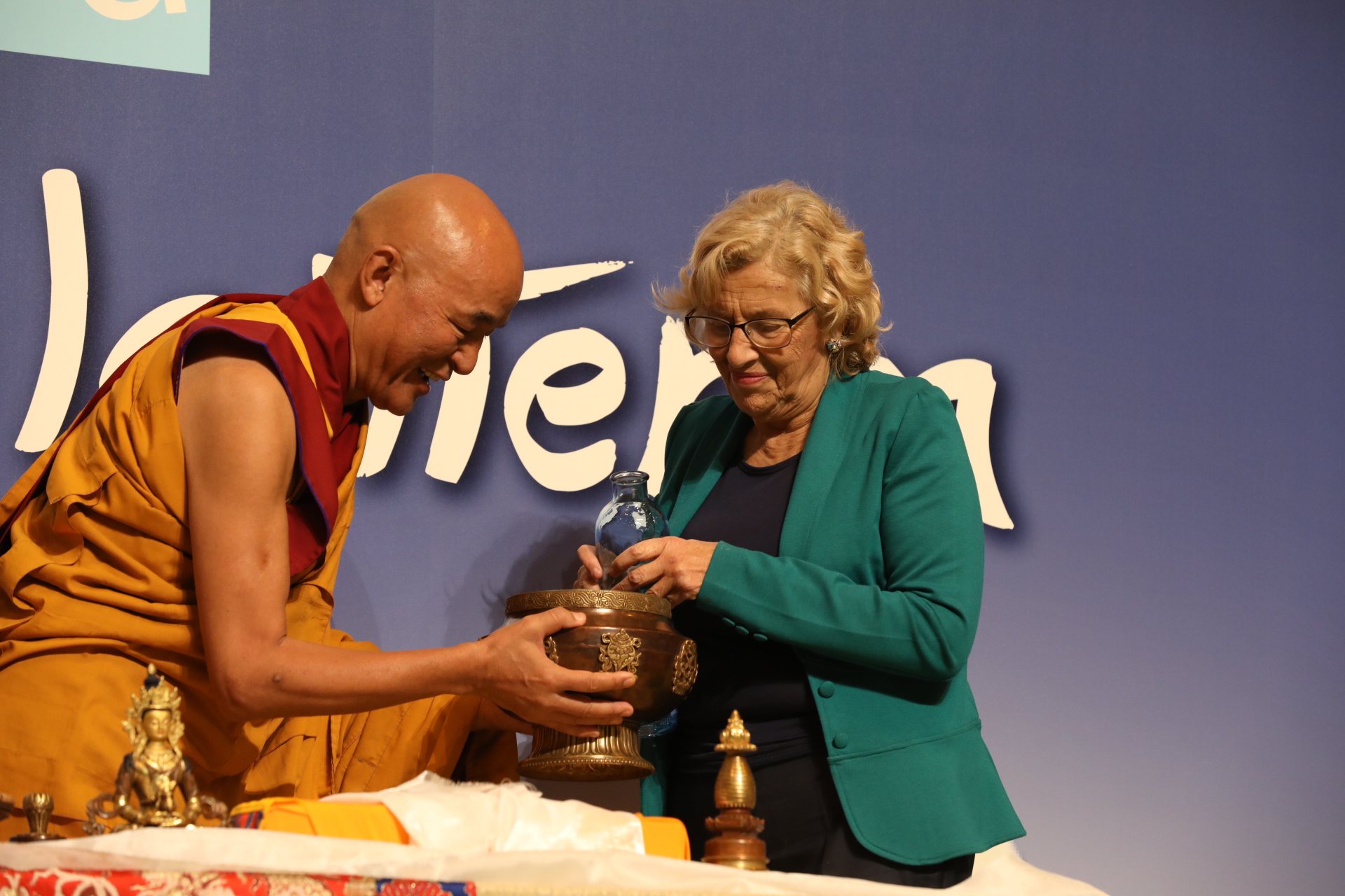 El acto ha estado cargado de simbolismo con una ceremonia en la que han participado 26 indígenas de etnias de los cinco continentes; 20 monjes budistas de paises como Nepal o Butan , y 70 alcaldes de diversos municipios españoles de montaña, junto con el regidor de Lumbini, la ciudad nepalí cuna de Buda con quienes previamente Carmena había suscrito dos memorandos de entendimiento (MOUs). En esa puja cada representante de las etnias ha portado un recipiente con agua de los cursos fluviales más importantes de sus pueblos. El líquido ha sido mezclado en una vasija donada por el Dalai Lama para la ocasión que ha sido rodeada por todos los participantes en una reivindicación del agua como lo único “inalienable, común y esencial”. Han escenificado así la necesidad de unir personas, razas, continentes en un objetivo común: conservar y cuidar la naturaleza.