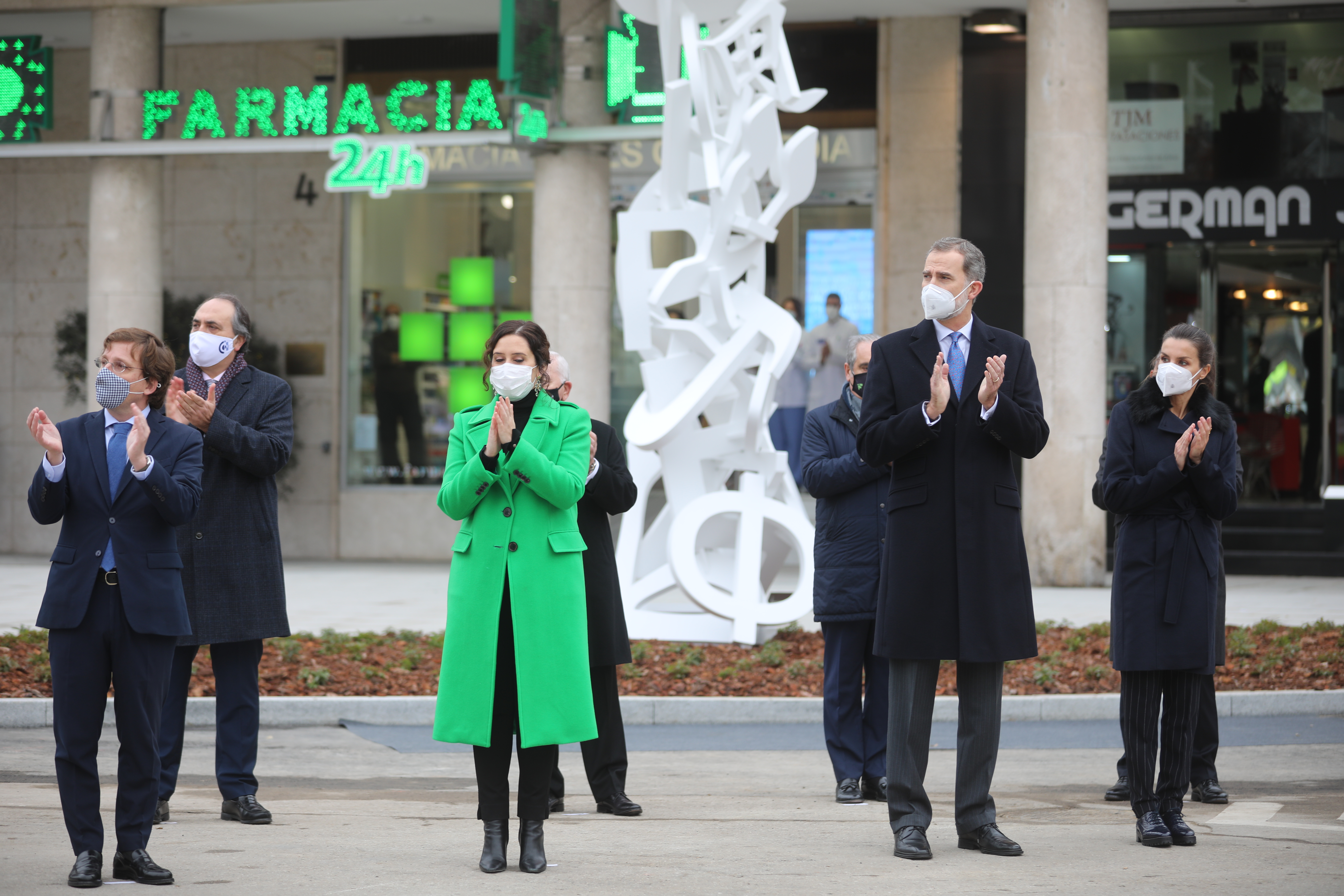 En el acto han estado presentes, entre otras autoridades, el ministro de Sanidad, Salvador Illa; la presidenta de la Comunidad de Madrid, Isabel Díaz-Ayuso; las delegadas de las áreas de Cultura, Turismo y Deporte, Andrea Levy, y de Obras y Equipamientos, Paloma García Romero; la concejala del distrito de Chamartín, Sonia Cea; el presidente del Consejo General de Colegios Oficiales de Médicos, Serafín Romero, y el autor de la obra, Jaume Plensa.
