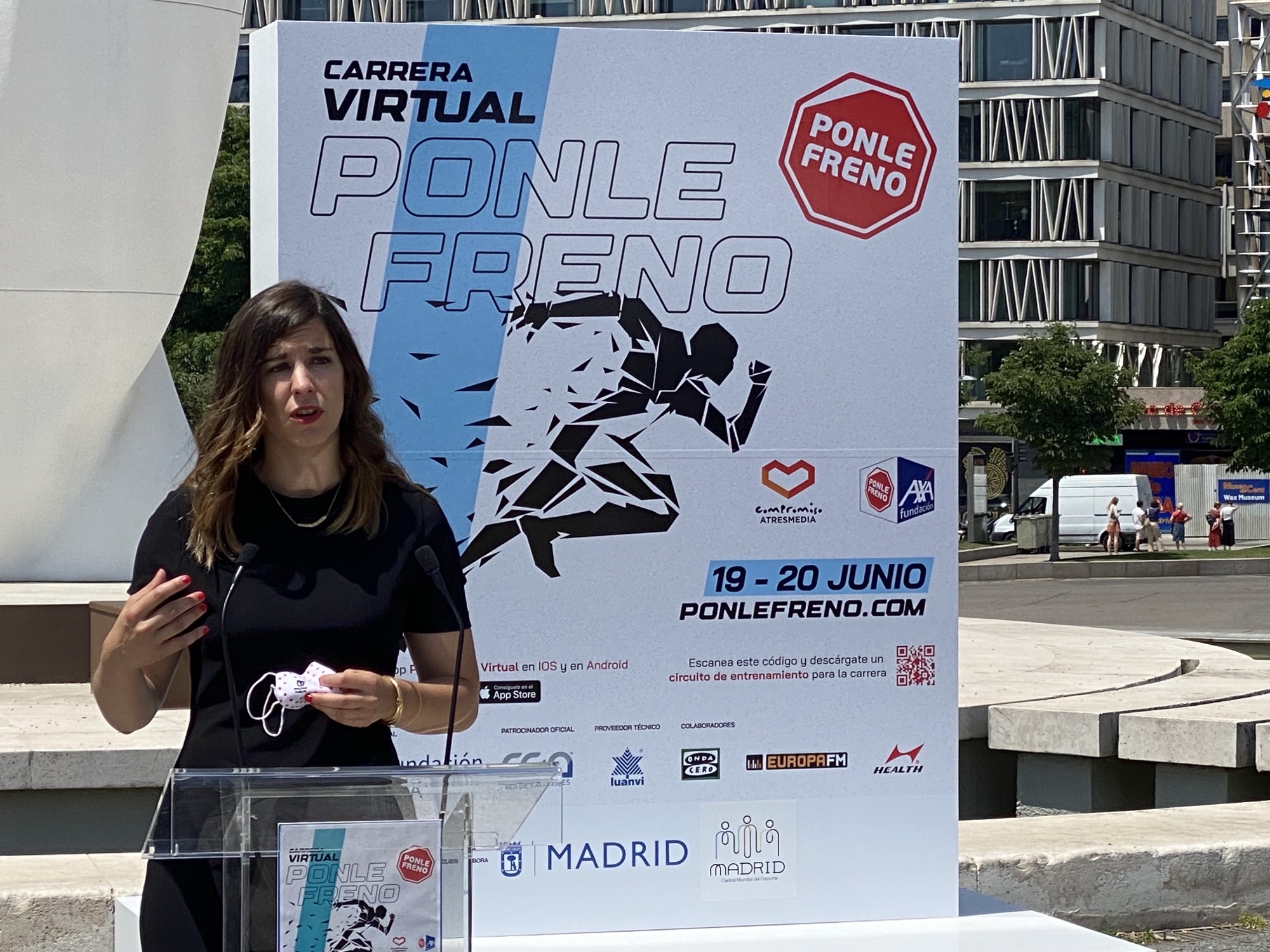 La concejala delegada de Deporte, Sofía Miranda, ha participado en la presentación de la carrera solidaria virtual ‘Ponle Freno’, organizada por Atrasmedia, que ha tenido lugar hoy en los jardines del Descubrimiento de la madrileña plaza de Colón y que un año más cuenta con Madrid como una de las sedes embajadoras del evento con una amplia campaña de publicidad exterior en sus calles para dinamizar la participación de los ciudadanos.