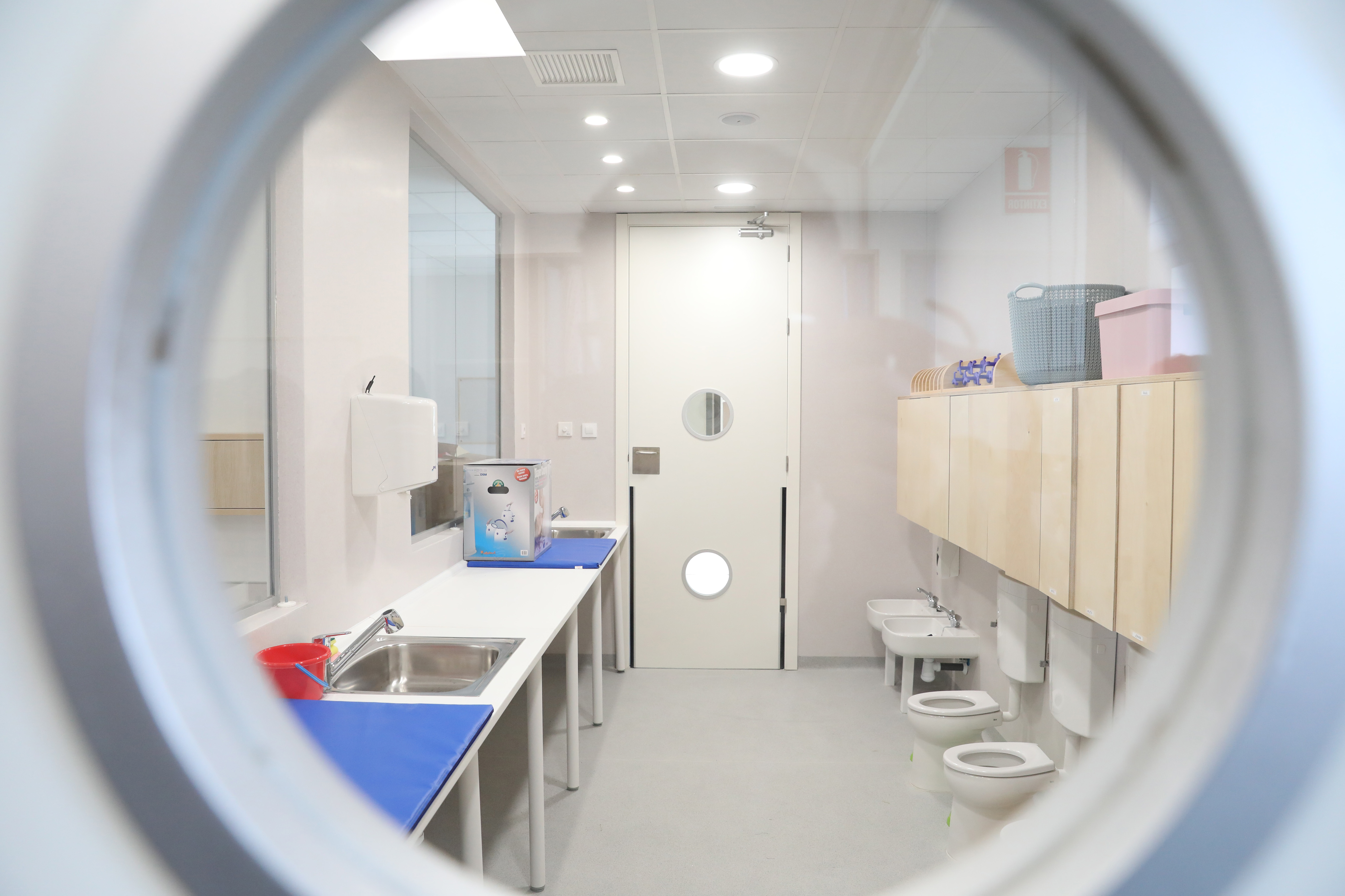 El primer cuerpo alberga los despachos y vestuarios para el profesorado, y las aulas de los menores de 1 a 2 años, junto con sus zonas de cambiadores y aseos, y acceso directo al espacio exterior de juegos.