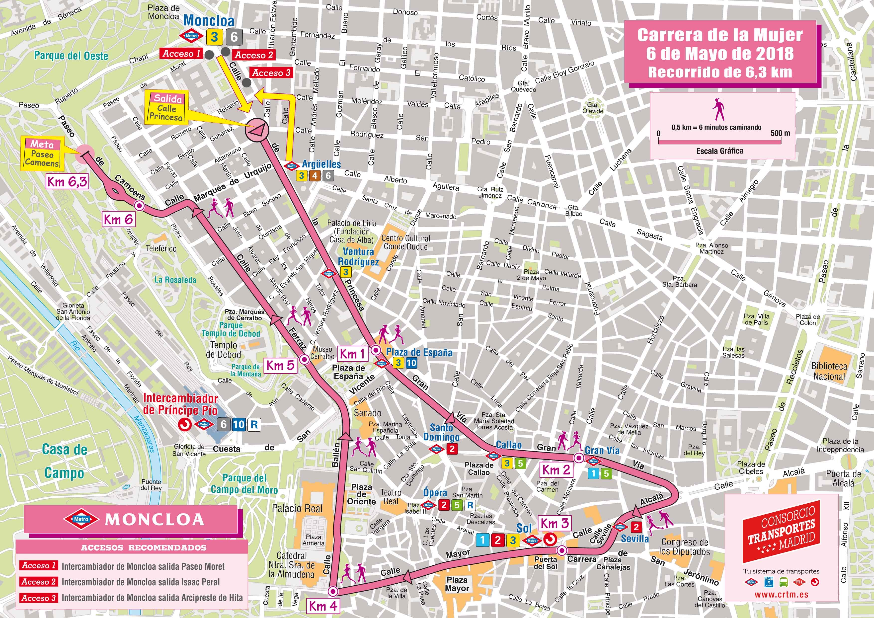 Son ya quince los años que cumple la Carrera de la Mujer de Madrid, un clásico en el calendario deportivo madrileño, y que este domingo 6 de mayo ha llenado otra vez la plaza de España, Gran Vía, Alcalá, Puerta del Sol, calle Mayor, calle Bailén, Palacio Real, paseo del Pintor Rosales, calle Ferraz y calle Marqués de Urquijo, de color rosa al grito de ¡No es no! desde las 9AM, y tras la lectura de un comunicado por la atleta paralímpica madrileña Gema Hassen-Beyen, en su tradicional recorrido de aproximadamente 6,3 km, con salida en la calle Princesa y línea de meta con festival de fitness por los monitores de la Federación Española de Aerobic, y actuación especial de Rosa López, que esta edición es la madrina de la prueba, en el paseo de Camoens.