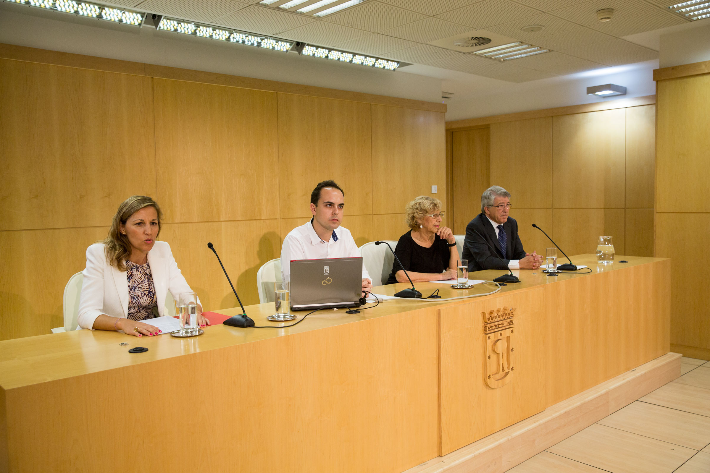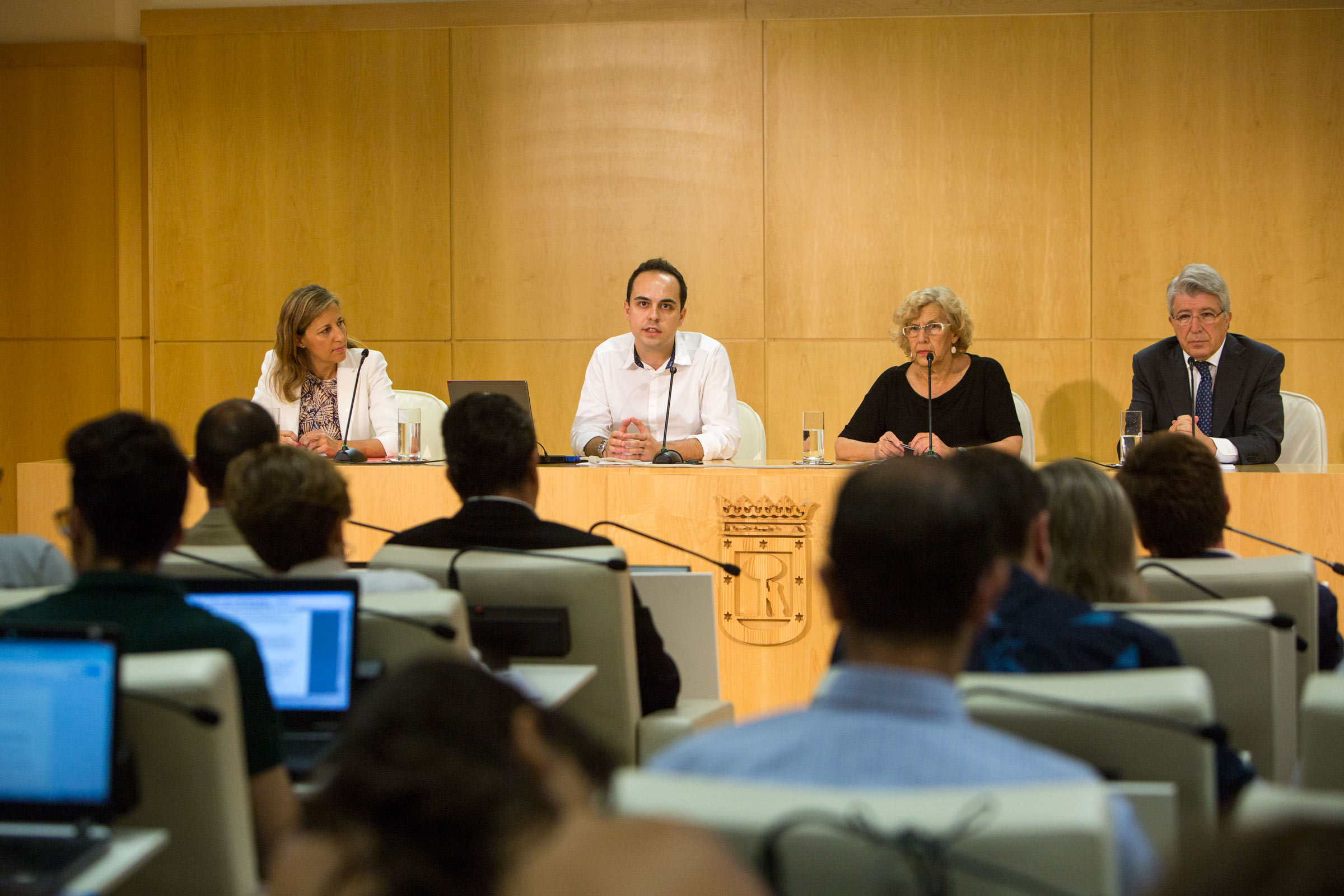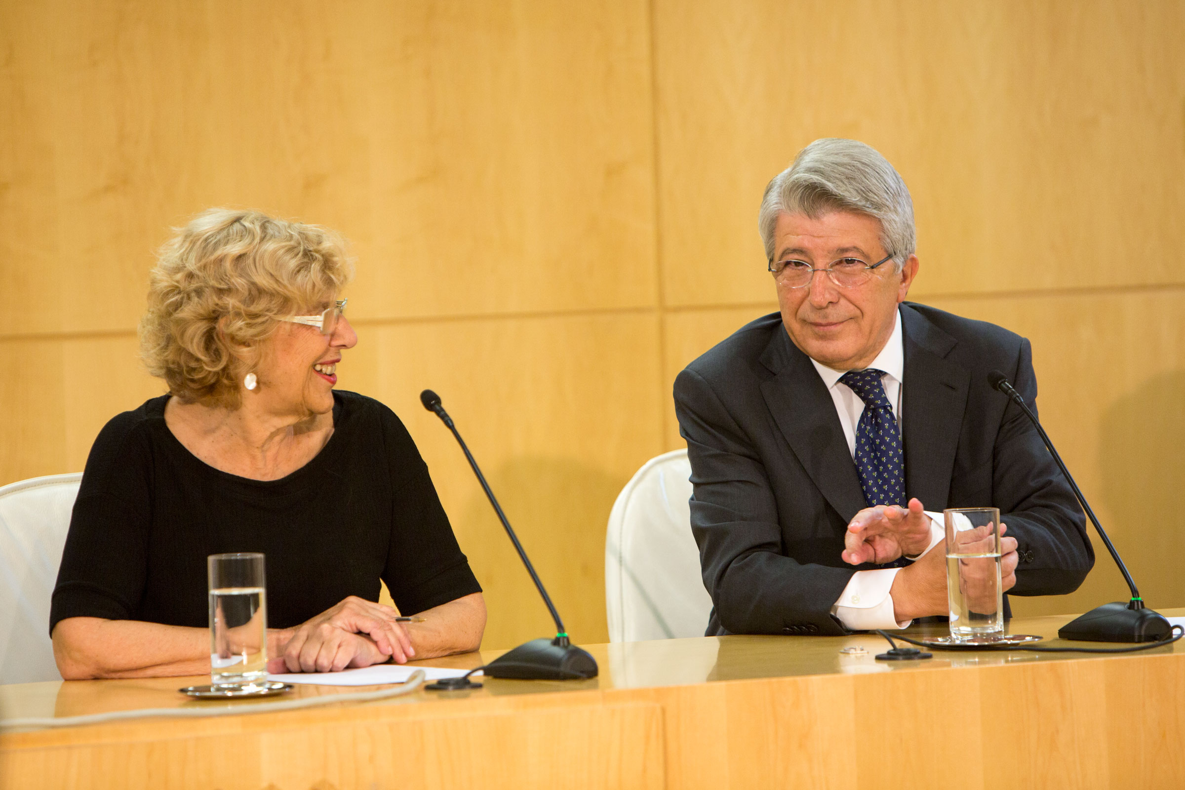La alcaldesa de Madrid, Manuela Carmena, junto al delegado del Área de Desarrollo Urbano Sostenible, José Manuel Calvo, el presidente del Atlético de Madrid, Enrique Cerezo, y la directora de la Unidad de Negocio de Patrimonio de Mahou San Miguel, Paloma Boceta, han presentado esta mañana (viernes, 1 de julio) en el Palacio de Cibeles, la nueva propuesta que se ajusta al modelo de ciudad del gobierno municipal, que apuesta por un urbanismo más sostenible e integrado en su entorno.