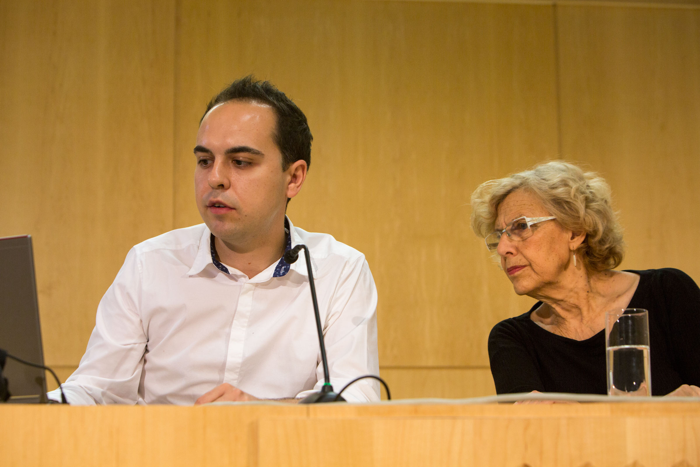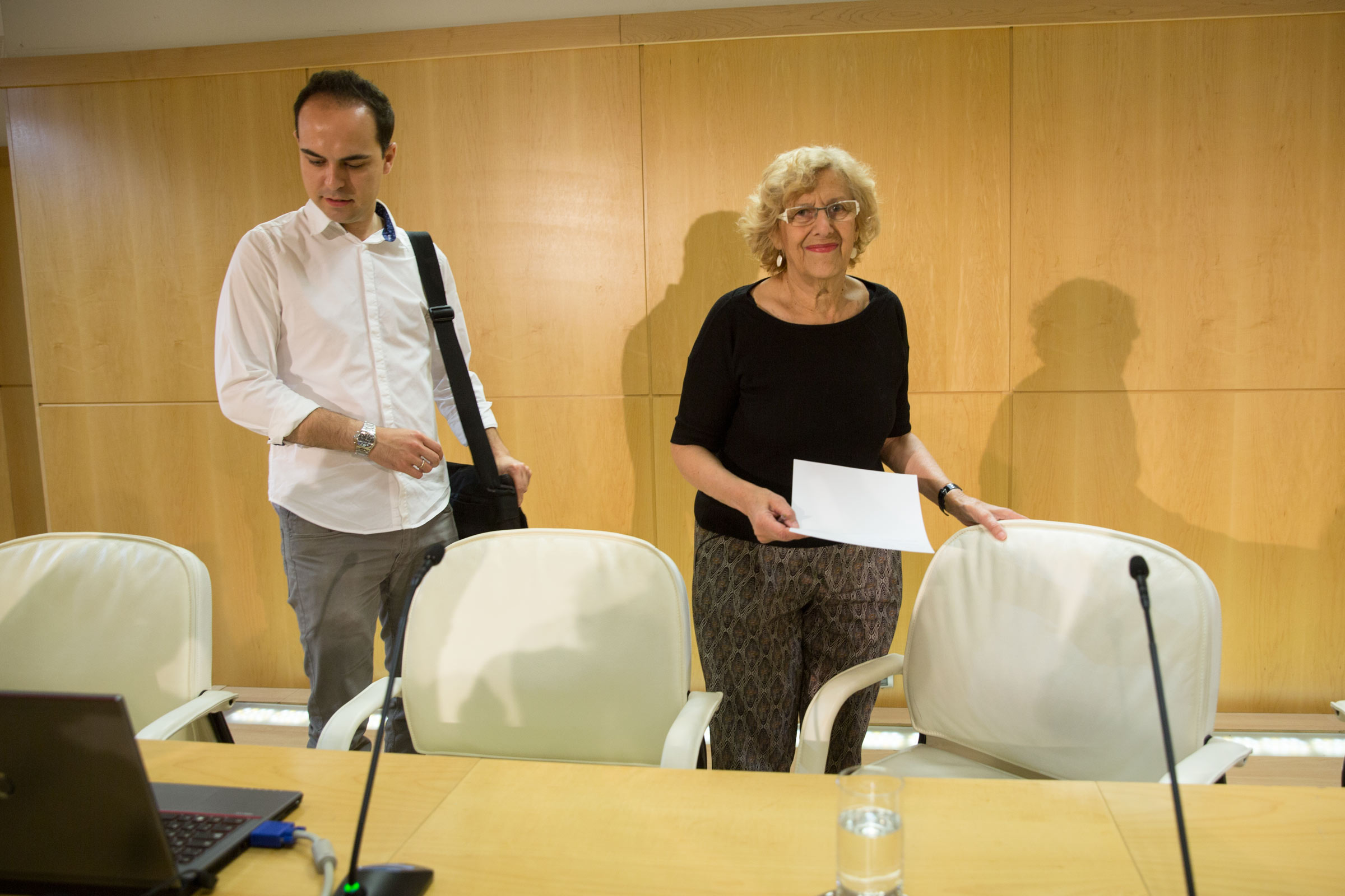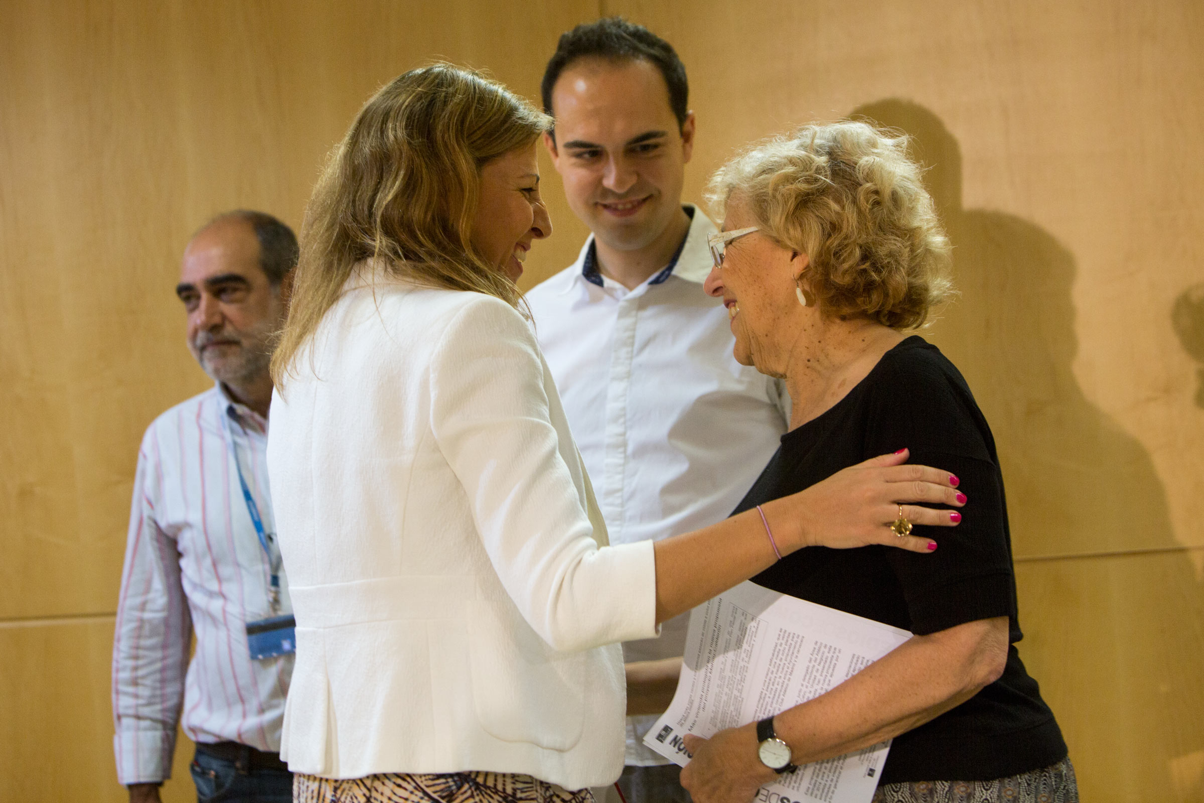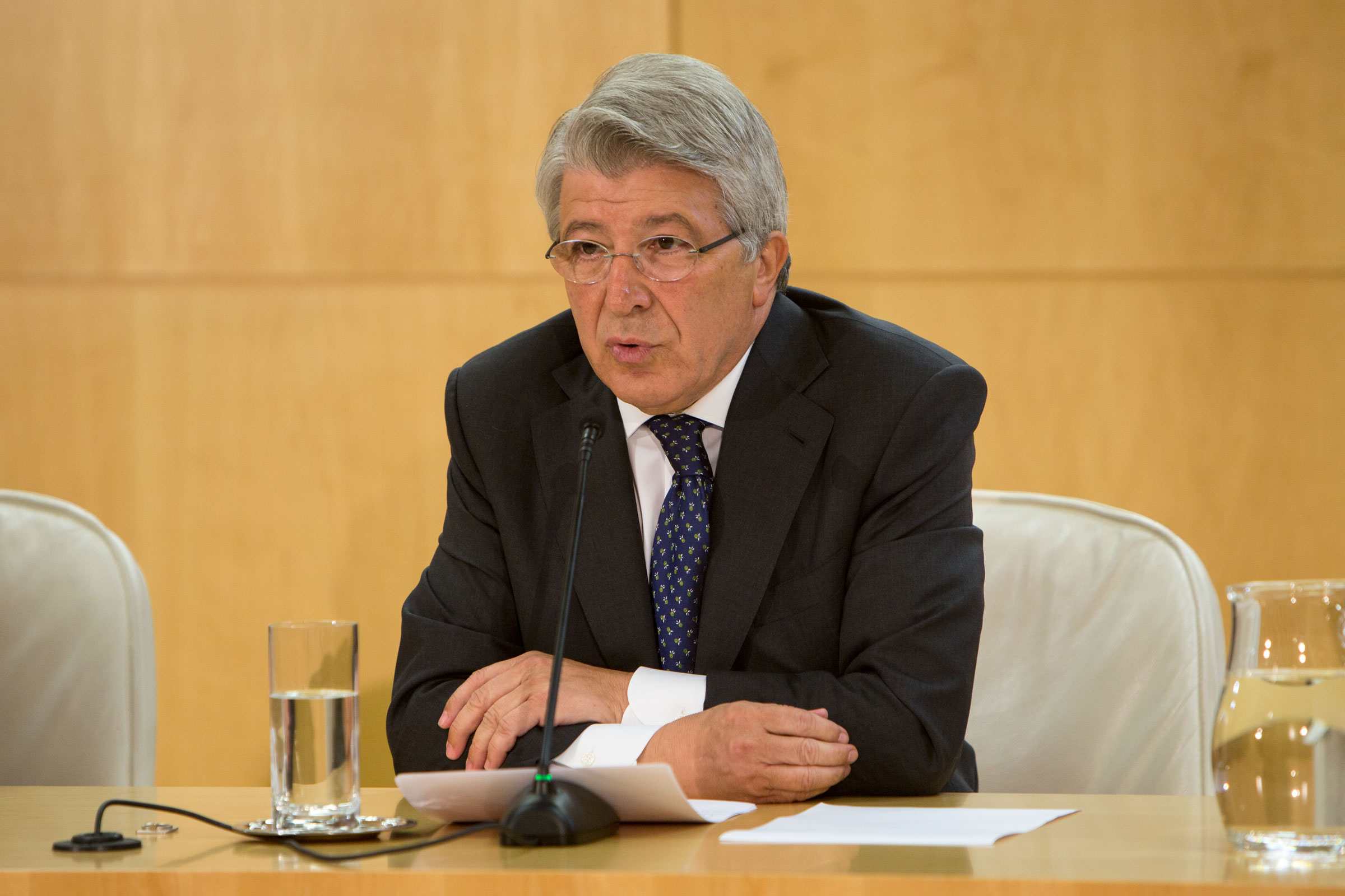 La alcaldesa de Madrid, Manuela Carmena, junto al delegado del Área de Desarrollo Urbano Sostenible, José Manuel Calvo, el presidente del Atlético de Madrid, Enrique Cerezo, y la directora de la Unidad de Negocio de Patrimonio de Mahou San Miguel, Paloma Boceta, han presentado esta mañana (viernes, 1 de julio) en el Palacio de Cibeles, la nueva propuesta que se ajusta al modelo de ciudad del gobierno municipal, que apuesta por un urbanismo más sostenible e integrado en su entorno.