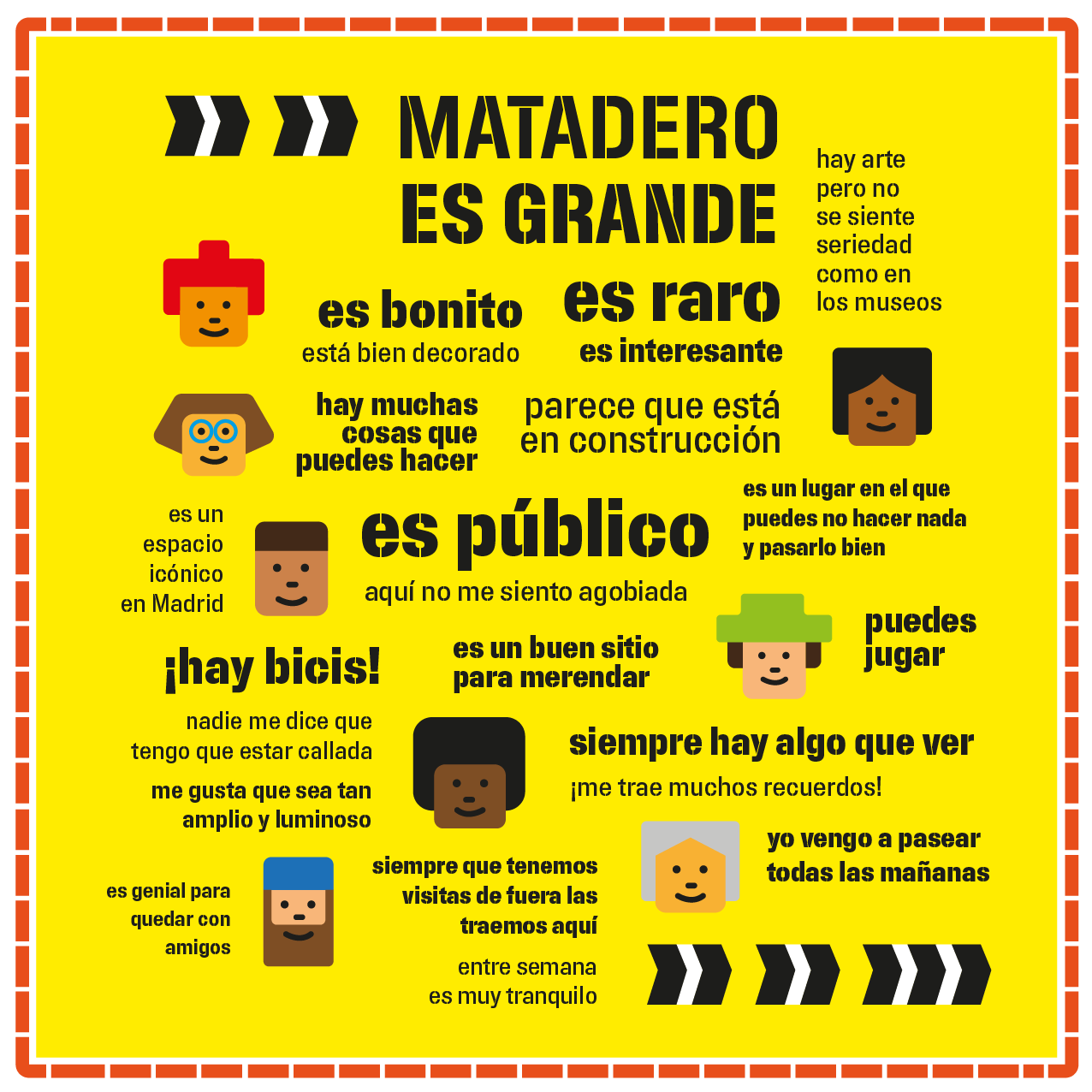 En palabras de la artista, este proyecto ha supuesto todo un reto de diseño, ya que “Matadero es como un puzle formado por múltiples piezas, que puede verse desde tantos puntos de vista distintos como visitantes recibe”. Su trabajo recoge y refleja esta idea del centro como un ente orgánico y heterogéneo, con el objetivo de que los ciudadanos se “apropien del espacio”, siguiendo las pautas y pistas del plano para “observarlo y notar su peculiaridad, ya que hay muchas formas de entender y vivir Matadero”.