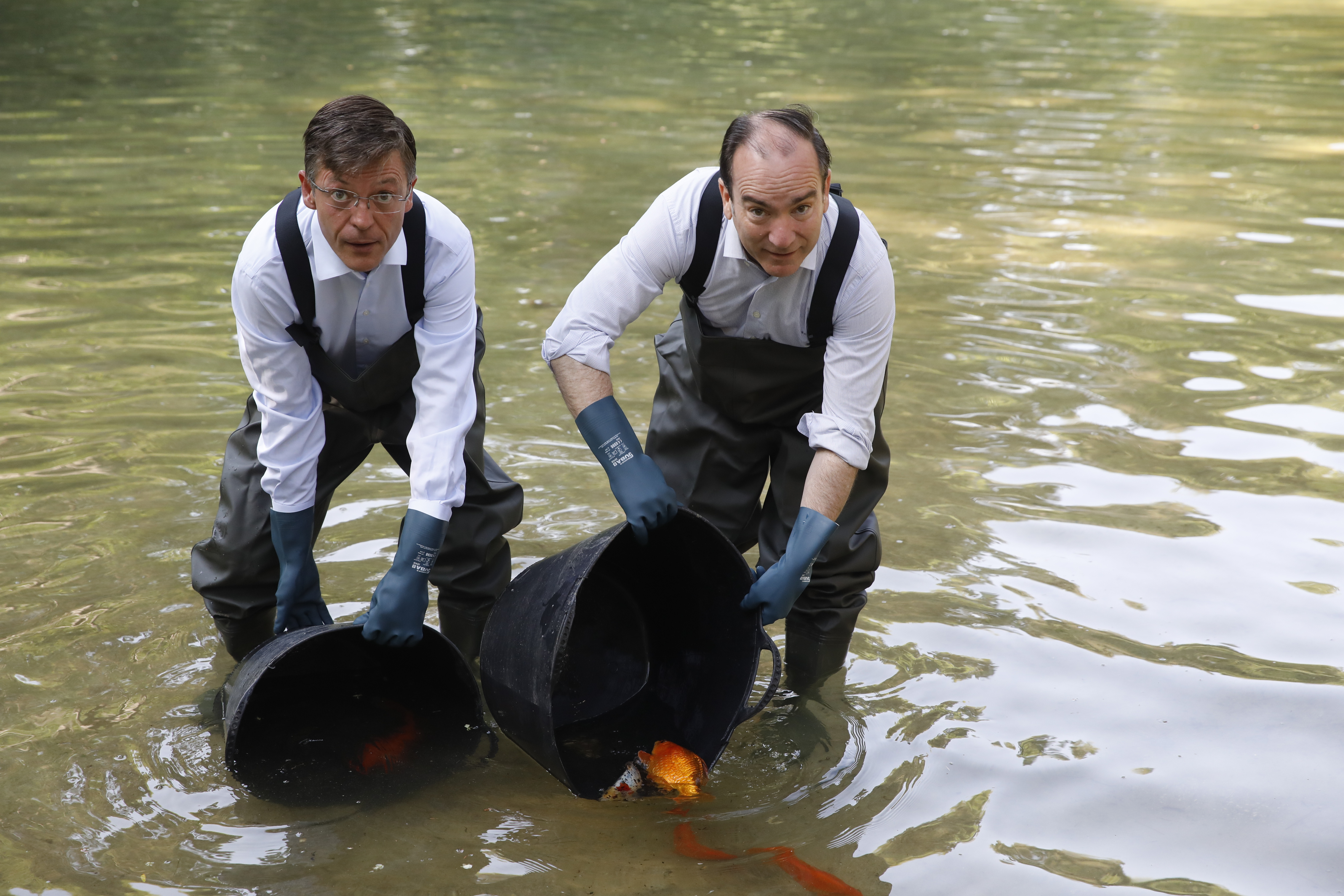 Carabante y Páramo, durante la reintroducción de ejemplares de carpines y tencas en el estanque de la Quinta de los Molinos