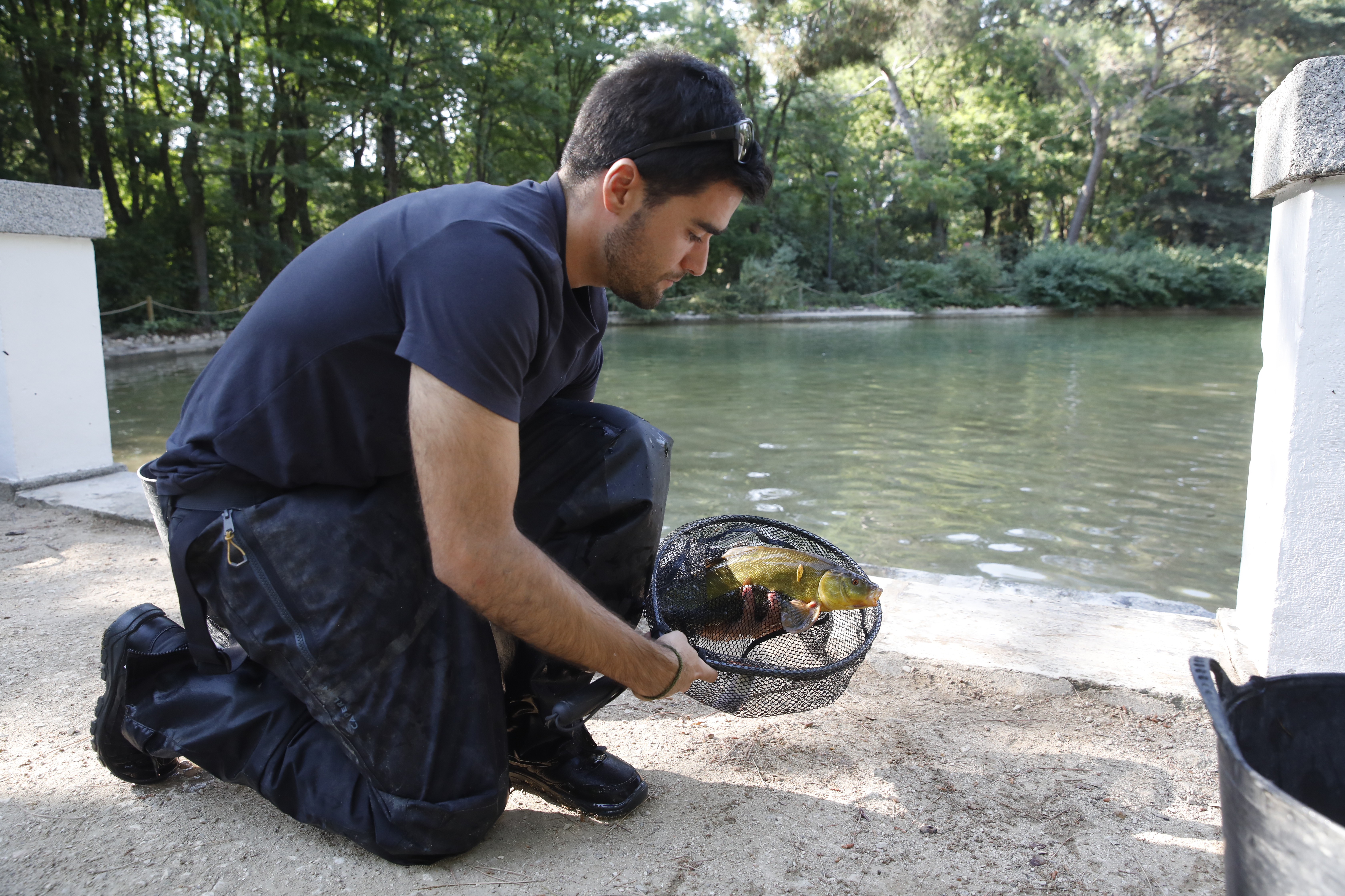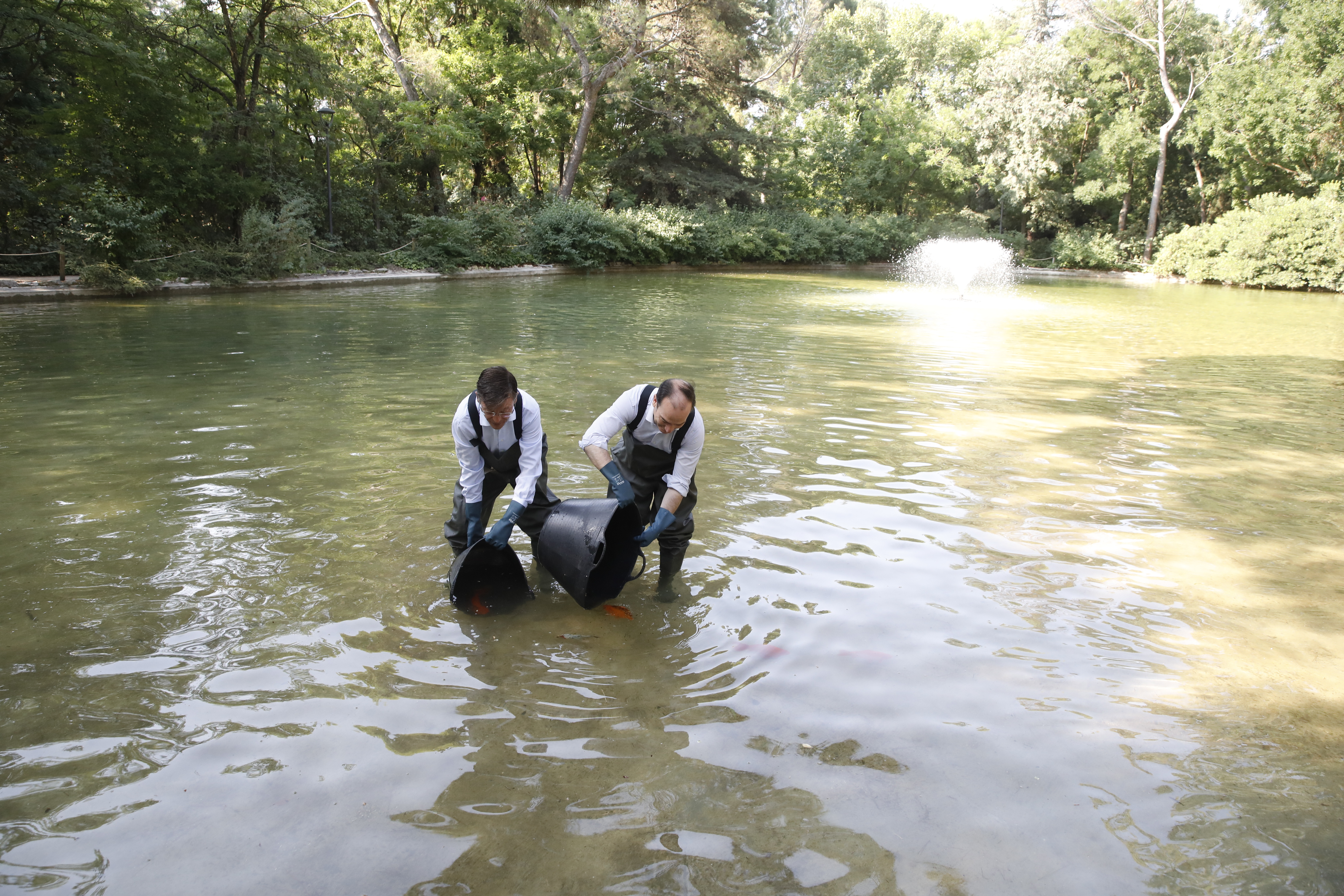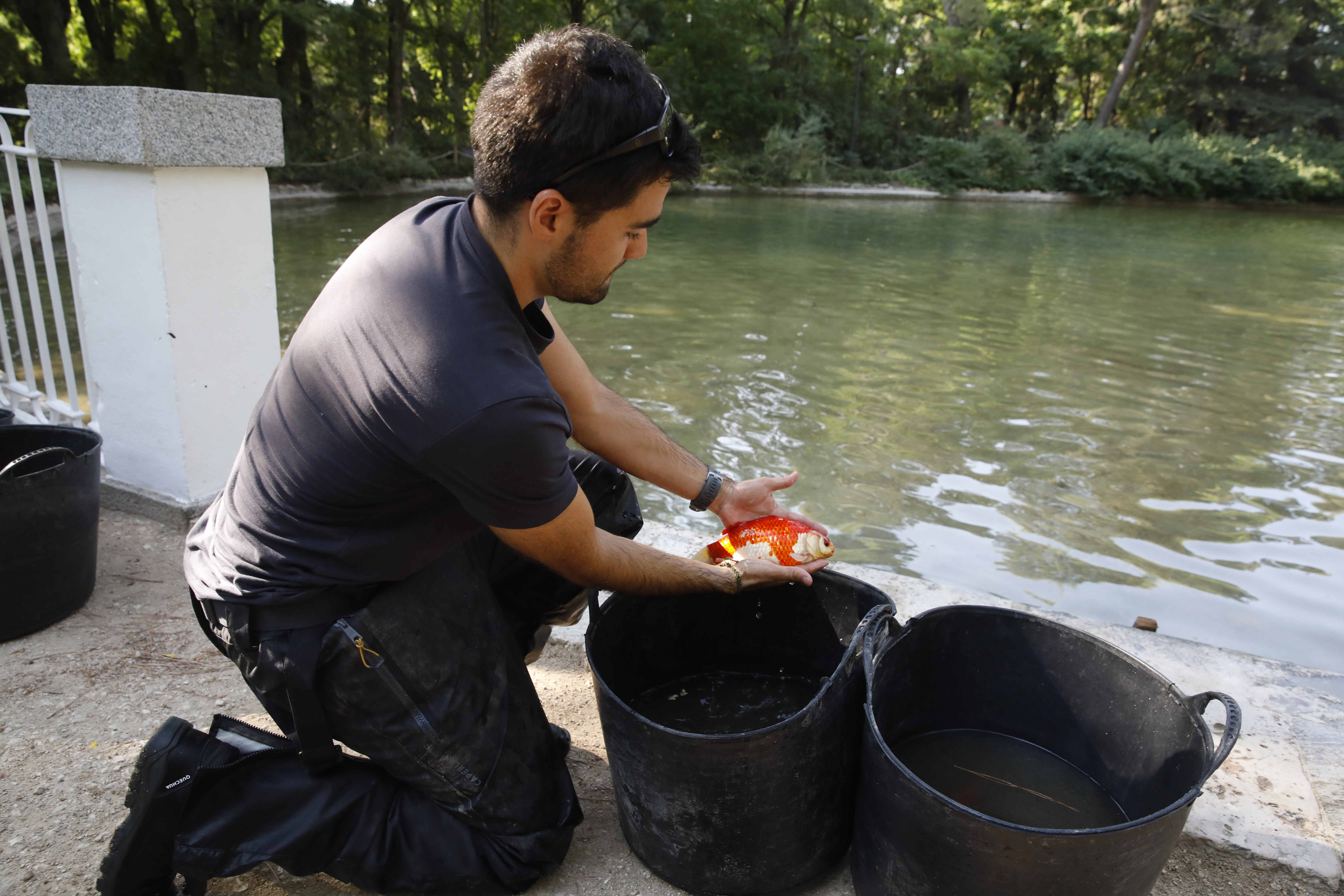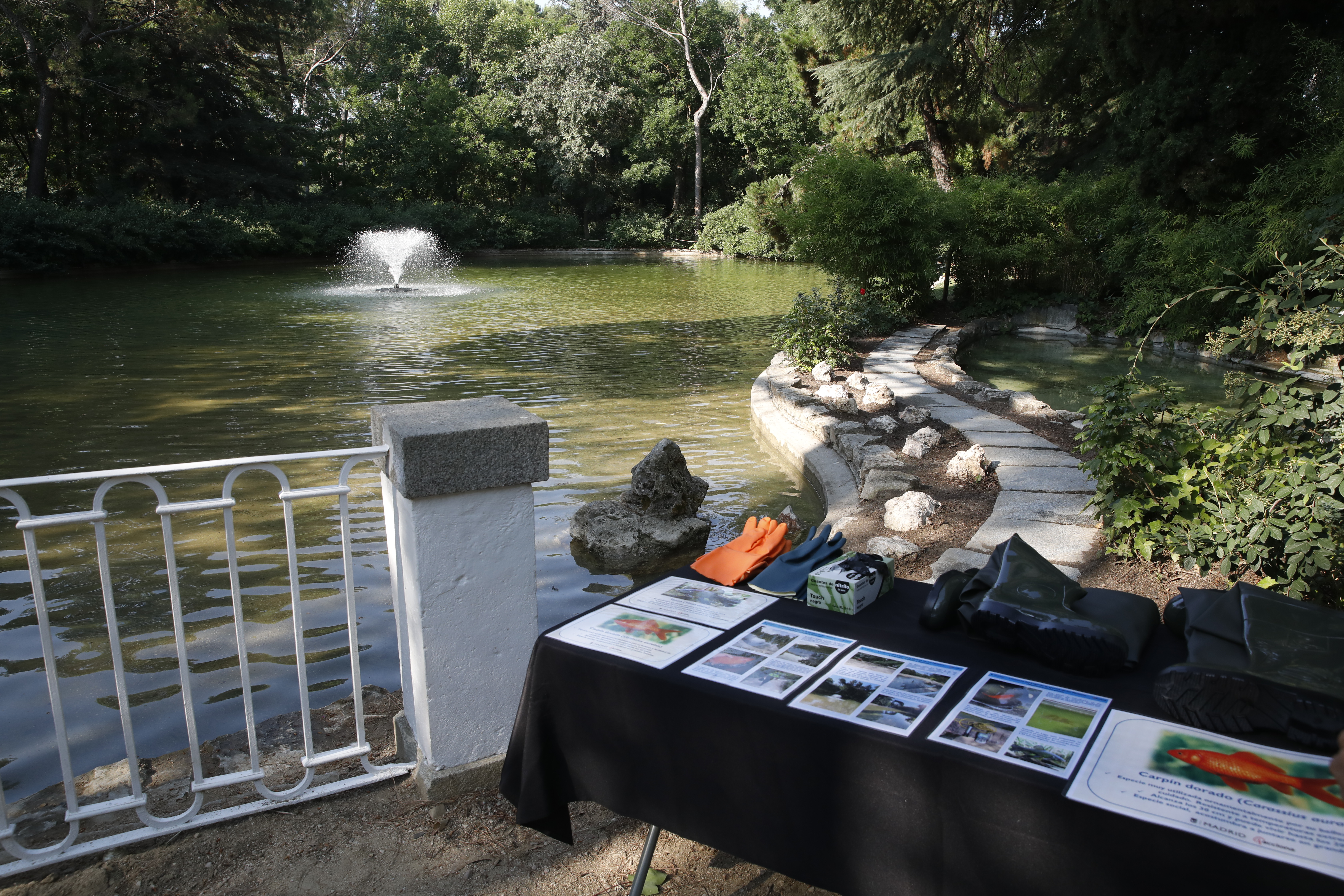 Los carpines rojos fueron trasladados a uno de los estanques gemelos de la quinta, provisto de bomba para asegurar la oxigenación del agua hasta su reintroducción en el lago. En esta estancia, también se detectó la presencia de percas americanas, gambusias y galápago americano, calificadas como especies exóticas invasoras. En cumplimiento de la legislación vigente, se les aplicó las correspondientes medidas de control, autorizadas previamente por la Comunidad de Madrid, en función de las competencias que tiene atribuidas.