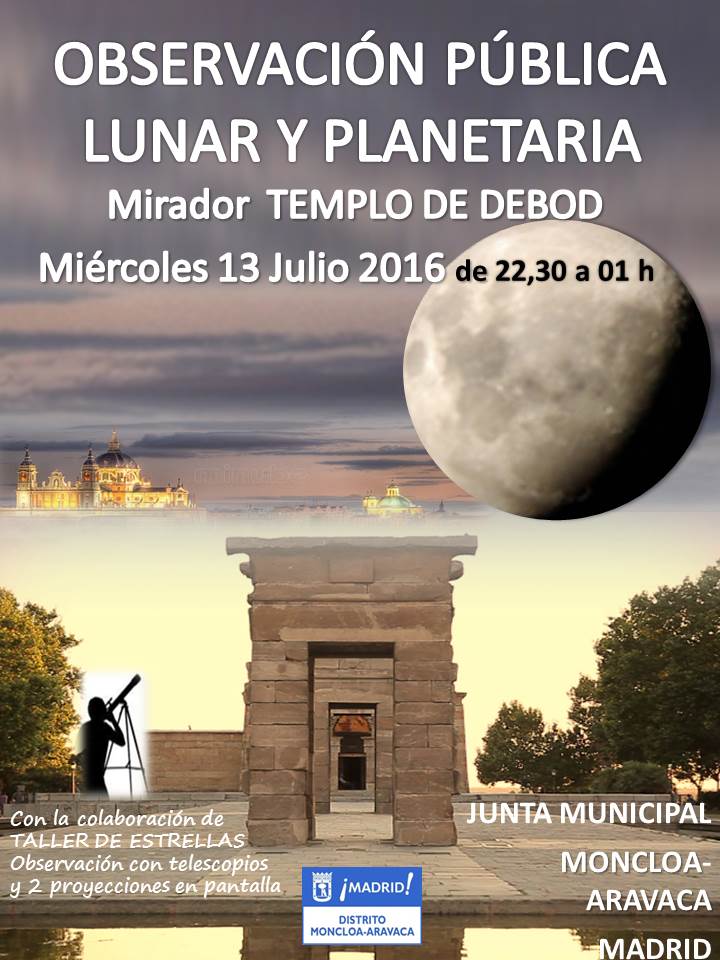 La Junta Municipal del distrito Moncloa-Aravaca ha organizado una observación lunar y planetaria en el mirador del Templo de Debod, el próximo miércoles, 13 de julio, de 22:30 horas a 1 horas. La actividad es gratuita y está pensada para disfrutar en familia.
