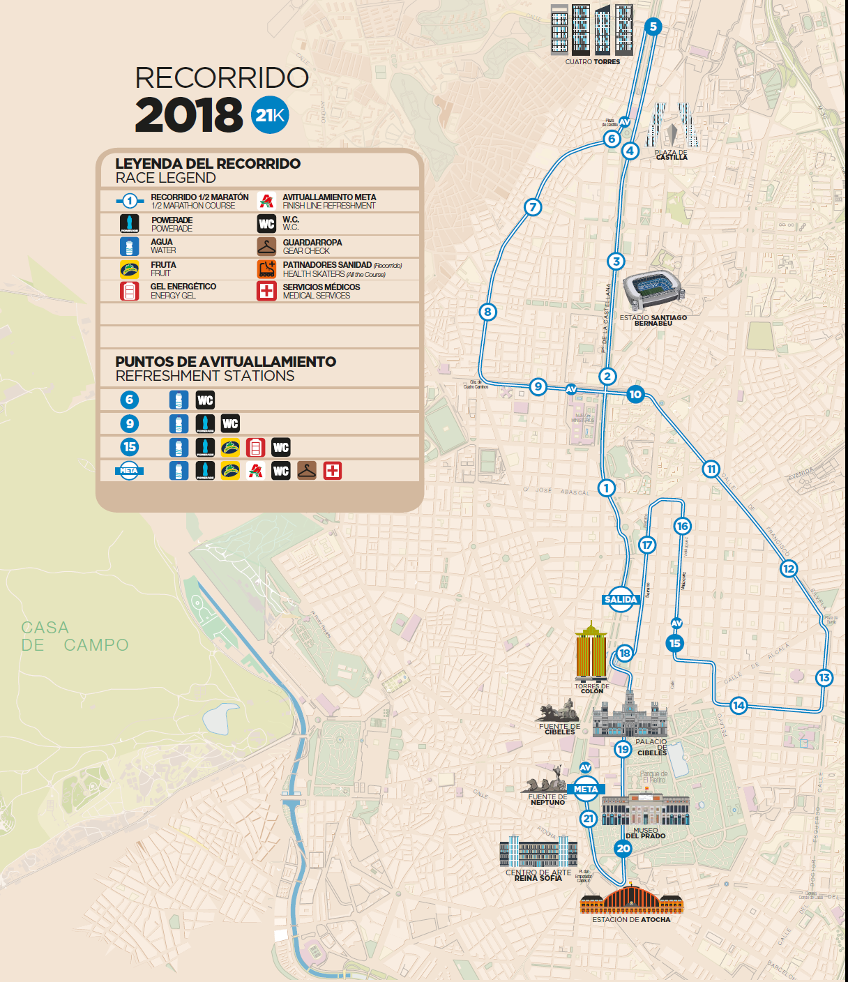 La salida será a las 8:55 desde Paseo de la Castellana (altura Jose Ortega Gasset) y el itinerario será: Glorieta Emilio Castelar – Plaza San Juan de la Cruz – Plaza de Lima – Lateral Paseo Castellana a Plaza de Castilla – Paseo Castellana “Puerta Europa” – Giro 180º a la altura de c/ Sinesio Delgado – Paseo Castellana “Puerta Europa” – Plaza Castilla – Bravo Murillo – Glorieta Cuatro Caminos – Raimundo Fernandez Villaverde – Puente Raimundo Fernandez Villaverde – Joaquín Costa – Plaza República Argentina – Joaquín Costa – Glorieta López de Hoyos – Francisco Silvela – Plaza Manuel Becerra – Doctor Esquerdo – O`Donnell – giro a derecha en Príncipe de Vergara – Goya – Velázquez – Maria de Molina – Serrano – Goya hacia Plaza de Colón por carriles izquierdos – Paseo Recoletos (contra – pegados teatro Fernán Núñez) – Jorge Juan – Serrano – Plaza Independencia – Alfonso XII – Paseo Infanta Isabel – Glorieta Emperador Carlos V – Paseo del Prado – Meta en Plaza Cánovas del Castillo.