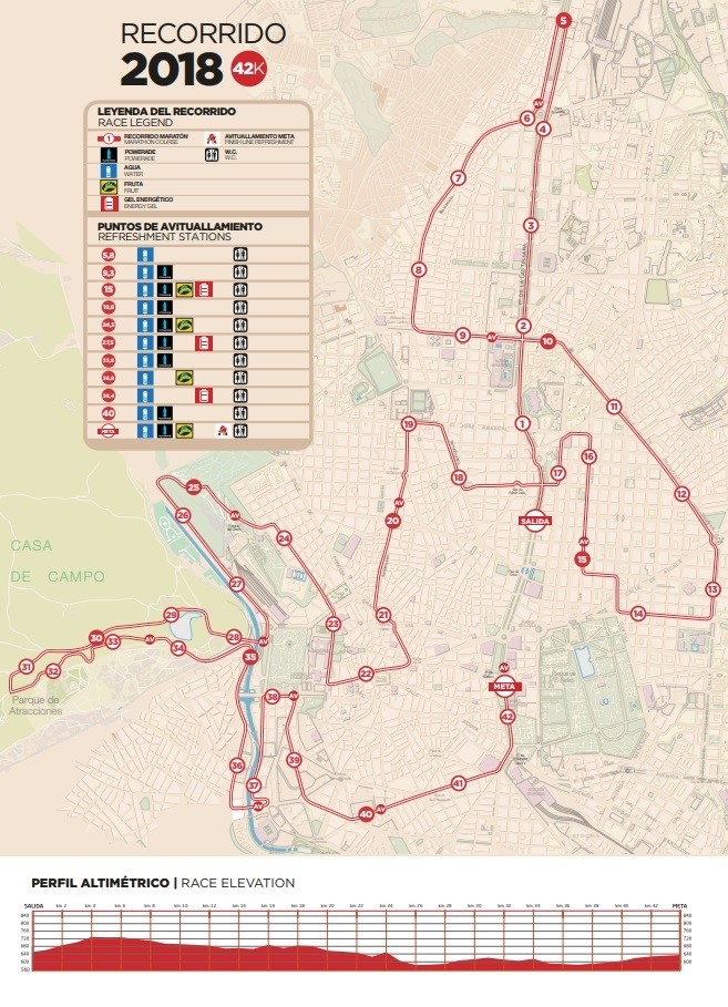 La salida será a las 9:00 horas desde Paseo Castellana (altura Jose Ortega Gasset) y el itinerario será: Glorieta Emilio Castelar – Plaza San Juan de la Cruz – Plaza Lima – lateral Paseo Castellana a Plaza Castilla – Paseo Castellana “Puerta Europa” – giro 180º a la altura c/ Sinesio Delgado – Paseo Castellana “Puerta Europa” – Plaza Castilla – Bravo Murillo – Glorieta Cuatro Caminos – Raimundo Fernandez Villaverde – Puente Raimundo Fernandez Villaverde – Joaquín Costa – Plaza República Argentina – Joaquín Costa – Glorieta López de Hoyos – Francisco Silvela – Plaza Manuel Becerra – Doctor Esquerdo – O´Donnell – giro a derecha a Príncipe de Vergara – Goya – Velázquez – Maria de Molina – Serrano – Paseo Eduardo Dato – Plaza Rubén Darío – Paseo Eduardo Dato – Santa Engracia – Jose Abascal (contra) – Bravo Murillo – Glorieta Quevedo – San Bernardo – Glorieta Ruiz Giménez – San Bernardo – Gran Vía – Plaza Callao – Preciados – Puerta Sol – Mayor – Bailen – Plaza Oriente – Bailen – Ferraz – Romero Robledo – Paseo Pintor Rosales – Paseo Camoens – Ruperto Chapi -  Puente de los Franceses – Avenida Valladolid – Paseo Florida – Glorieta San Vicente – Puente del Rey – Paseo Embarcadero – Paseo Azul – Paseo Maria Teresa – Camino Robledal – Paseo Venta – Ronda Lago – Glorieta Patines – Paseo Puerta del Ángel – Avenida Portugal – Paseo Marques Monistrol – Paseo Ermita del Santo – Puente San Isidro – Paseo Melancólicos (contra dirección) – San Alejandro – Paseo Virgen del Puerto – Segovia – Ronda Segovia – Paseo Imperial – Plaza Francisco Morano – Paseo Doctor Vallejo Nájera – Plaza Ortega y Munilla (contra dirección) – Paseo Acacias (contra dirección) – Glorieta Embajadores – Ronda Valencia (derecha del túnel) – Ronda Atocha – Paseo Santa Maria de la Cabeza (contra dirección) – Plaza Emperador Carlos V – Paseo Prado – Meta en Plaza Cánovas del Castillo.