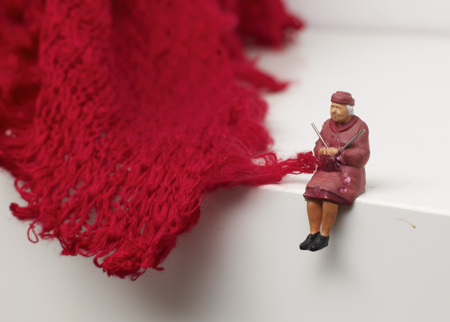 Un heteropatriarcado que se escenifica en la fotografía de Eva Lootz, donde una mujer va tejiendo la propia indumentaria que viste en Ella vive en el traje que se está haciendo, de modo similar al de la mujer de avanzada edad de la diminuta escultura de Liliana Porter.