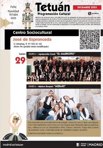 Un espectáculo musical lleno de energía y emoción, donde un coro interpreta clásicos espirituales y villancicos con el característico ritmo, fuerza y armonía del gospel. A través de potentes voces y melodías llenas de esperanza, la actuación transmite el verdadero espíritu navideño, invitando al público a celebrar la alegría, la unión y la fe propias de estas fechas.