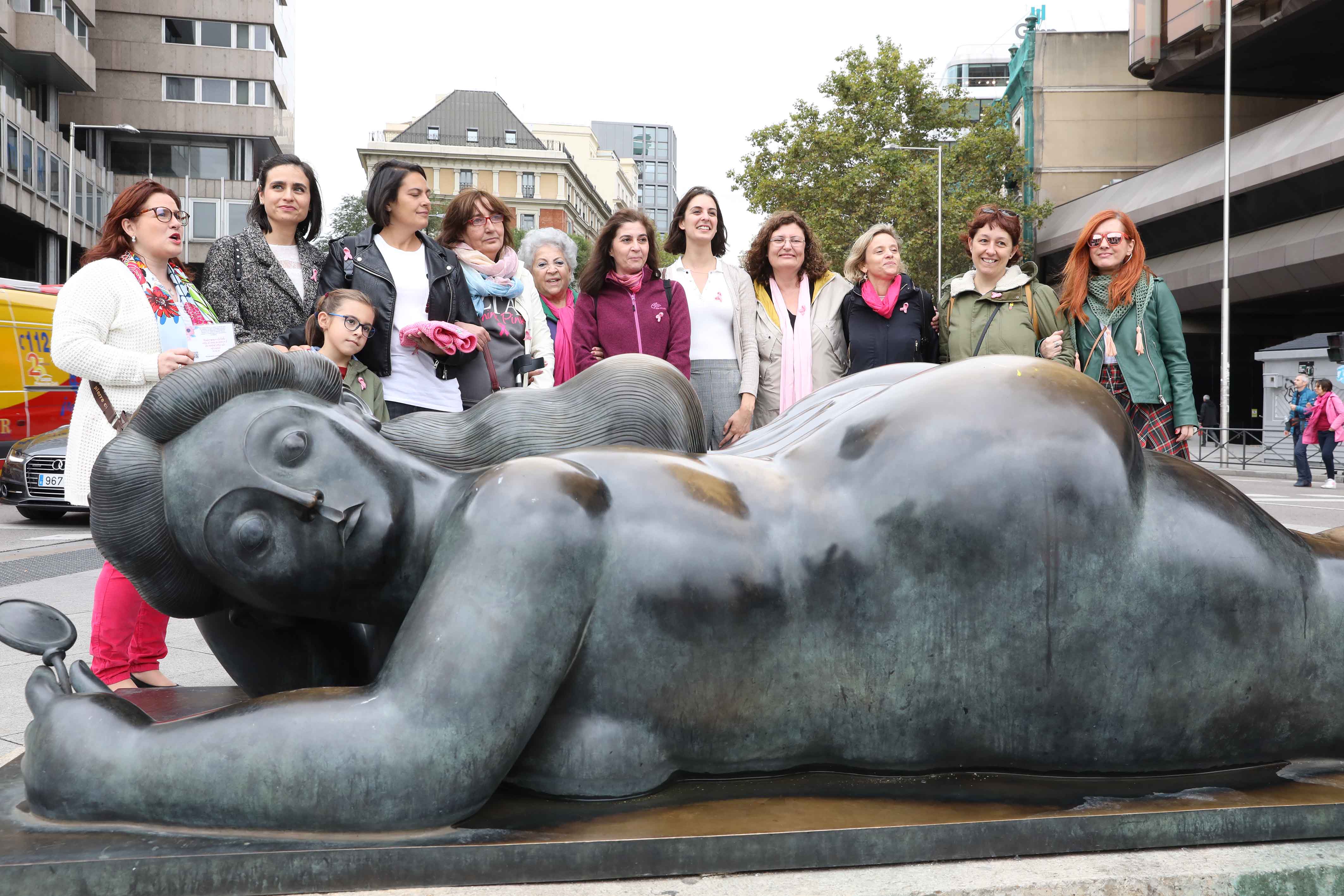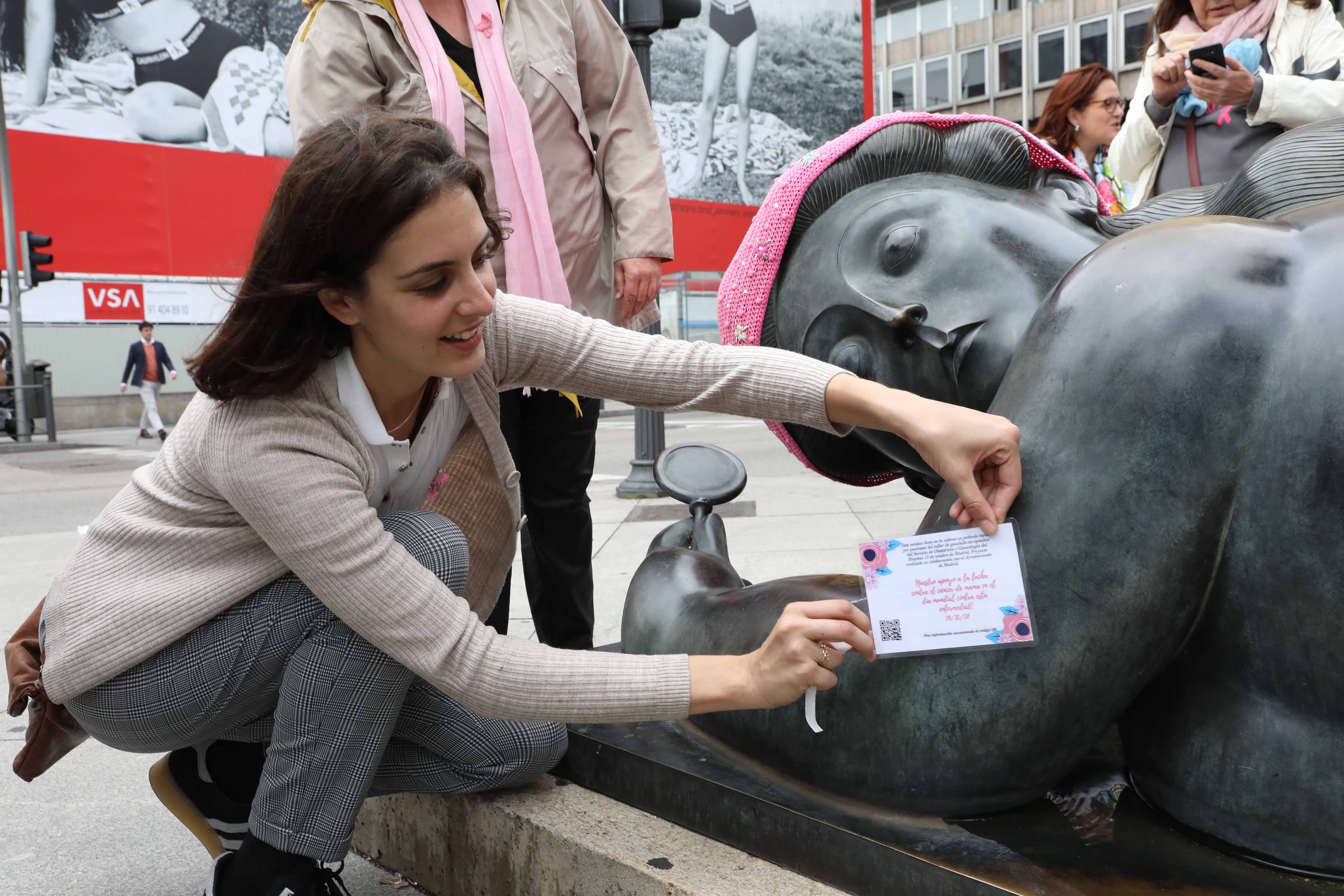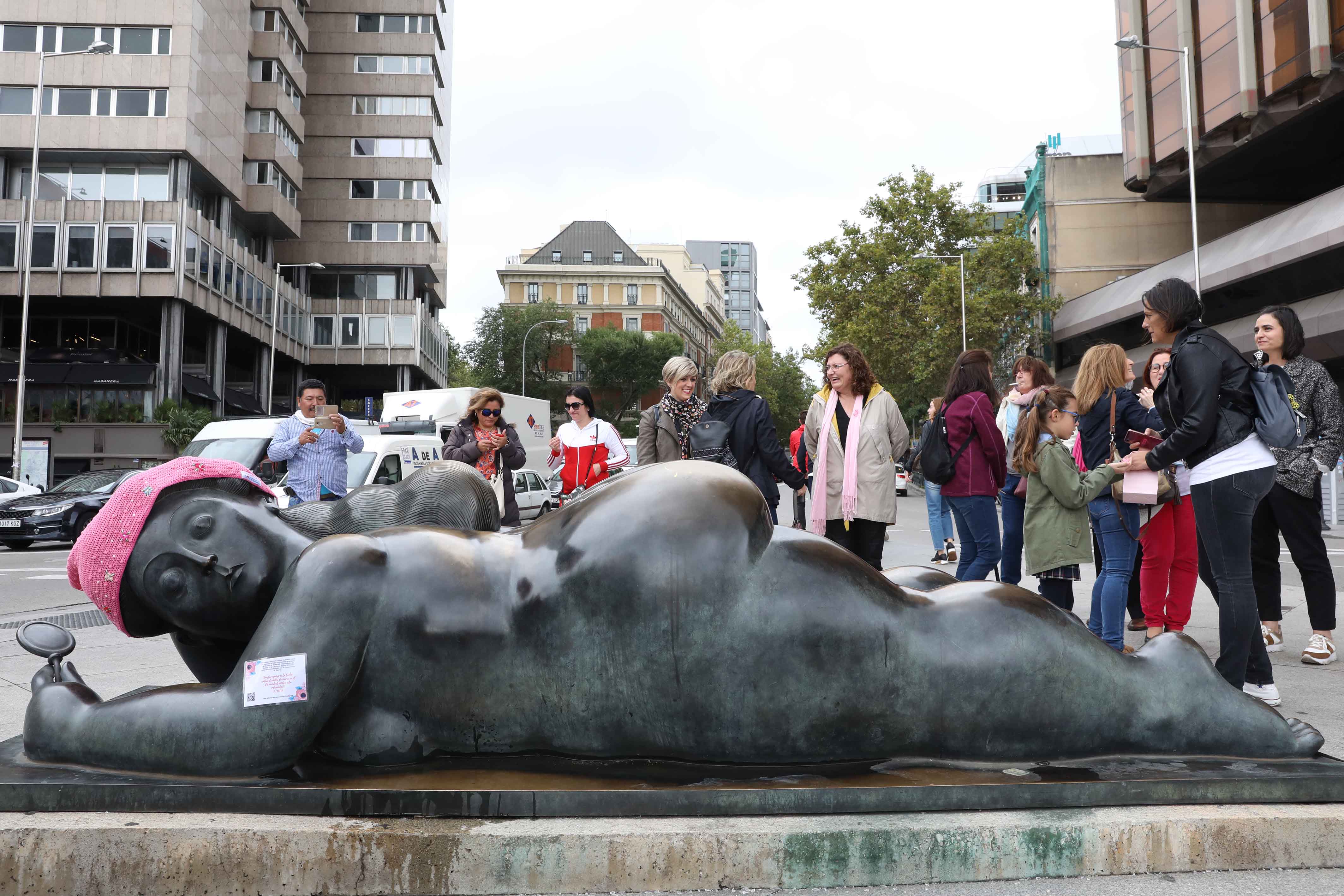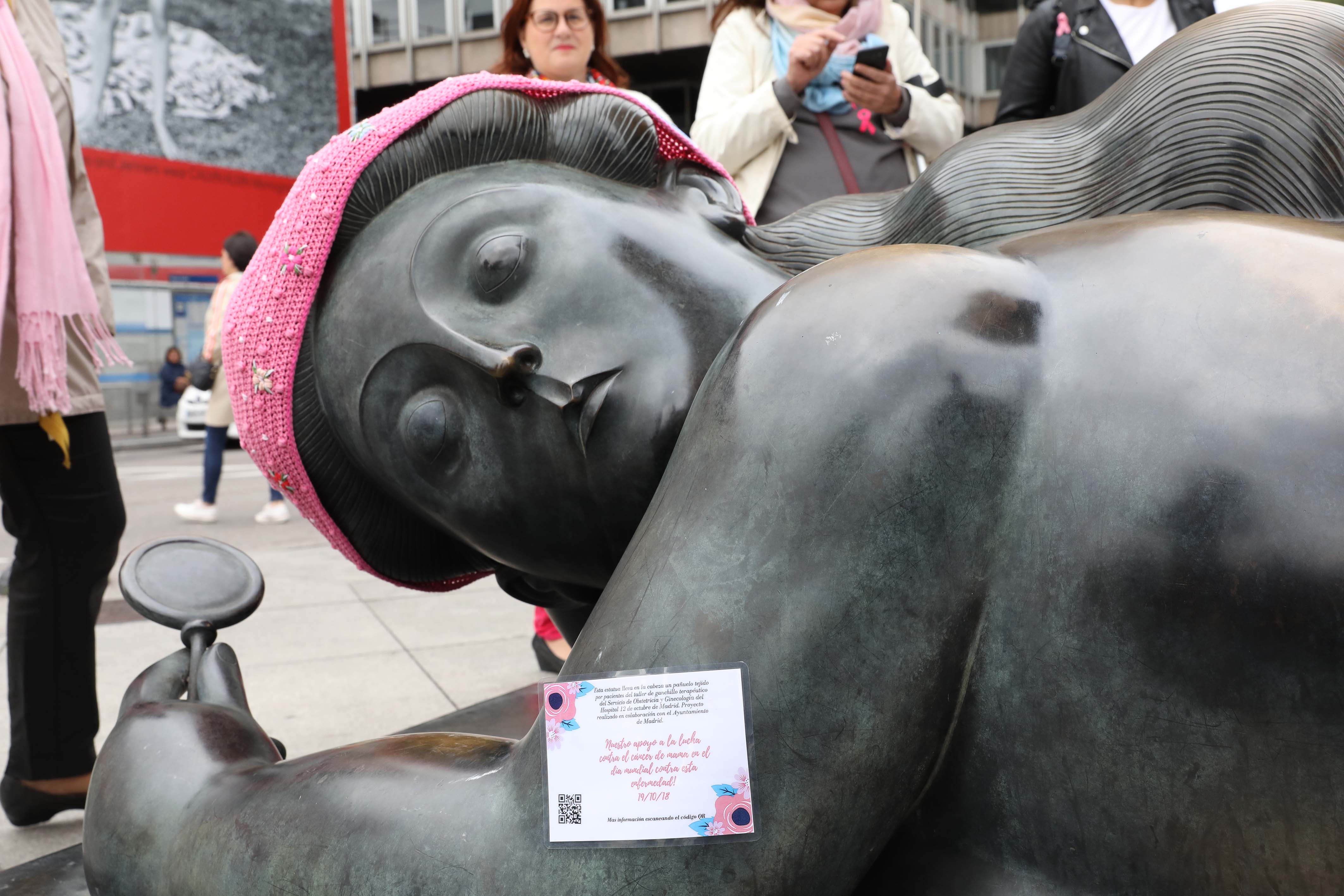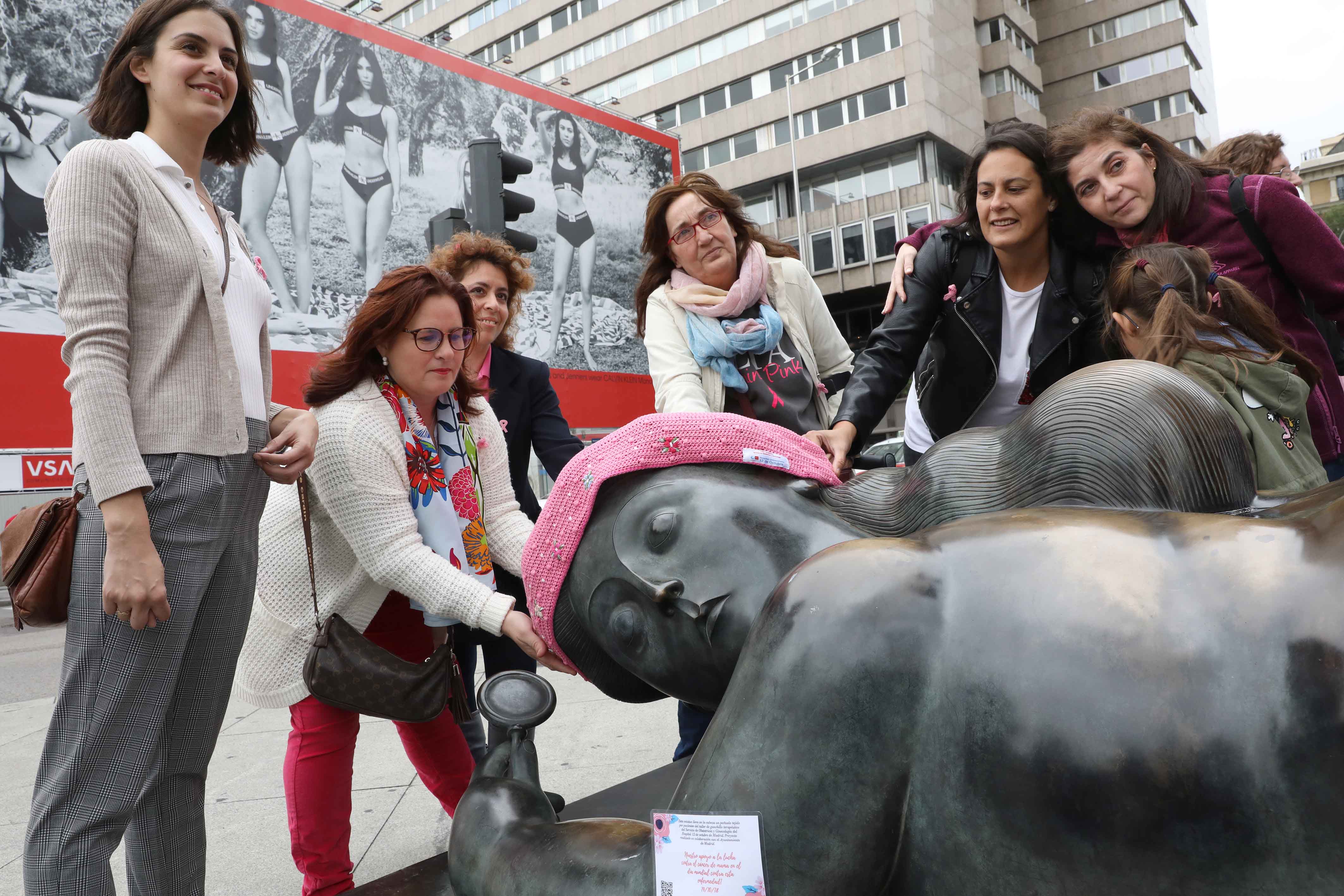 La portavoz del Gobierno municipal, Rita Maestre, ha cubierto esta mañana, viernes 19 de octubre, la cabeza de la escultura Mujer con Espejo, de Botero, situada en la plaza de Colón, con un pañuelo de ganchillo rosa como muestra de apoyo en el Día Mundial del Cáncer de Mama. El Ayuntamiento de Madrid se suma así a la iniciativa del Hospital 12 de Octubre consistente en colocar diversos pañuelos en diez esculturas distribuidas en diferentes puntos de la ciudad.