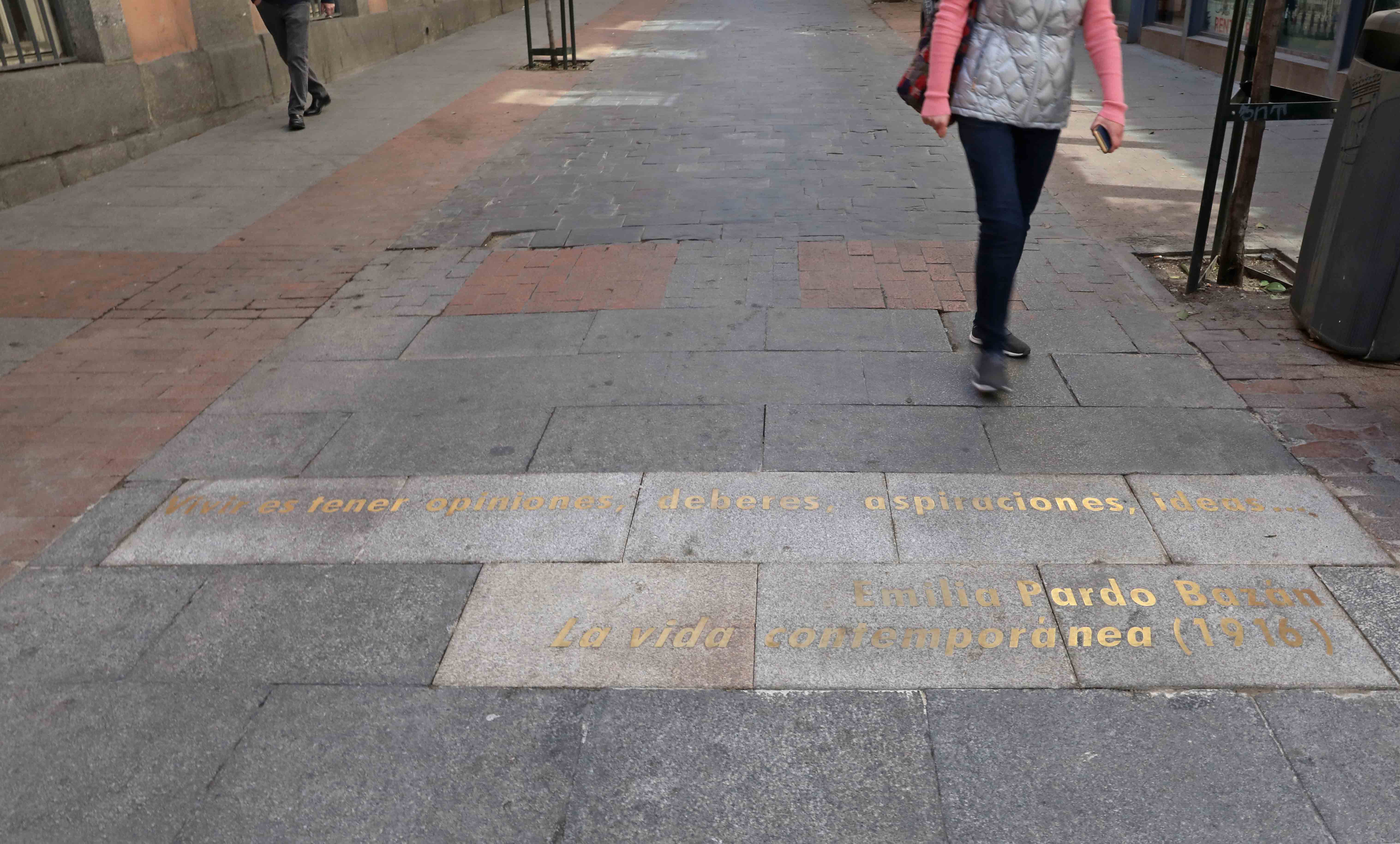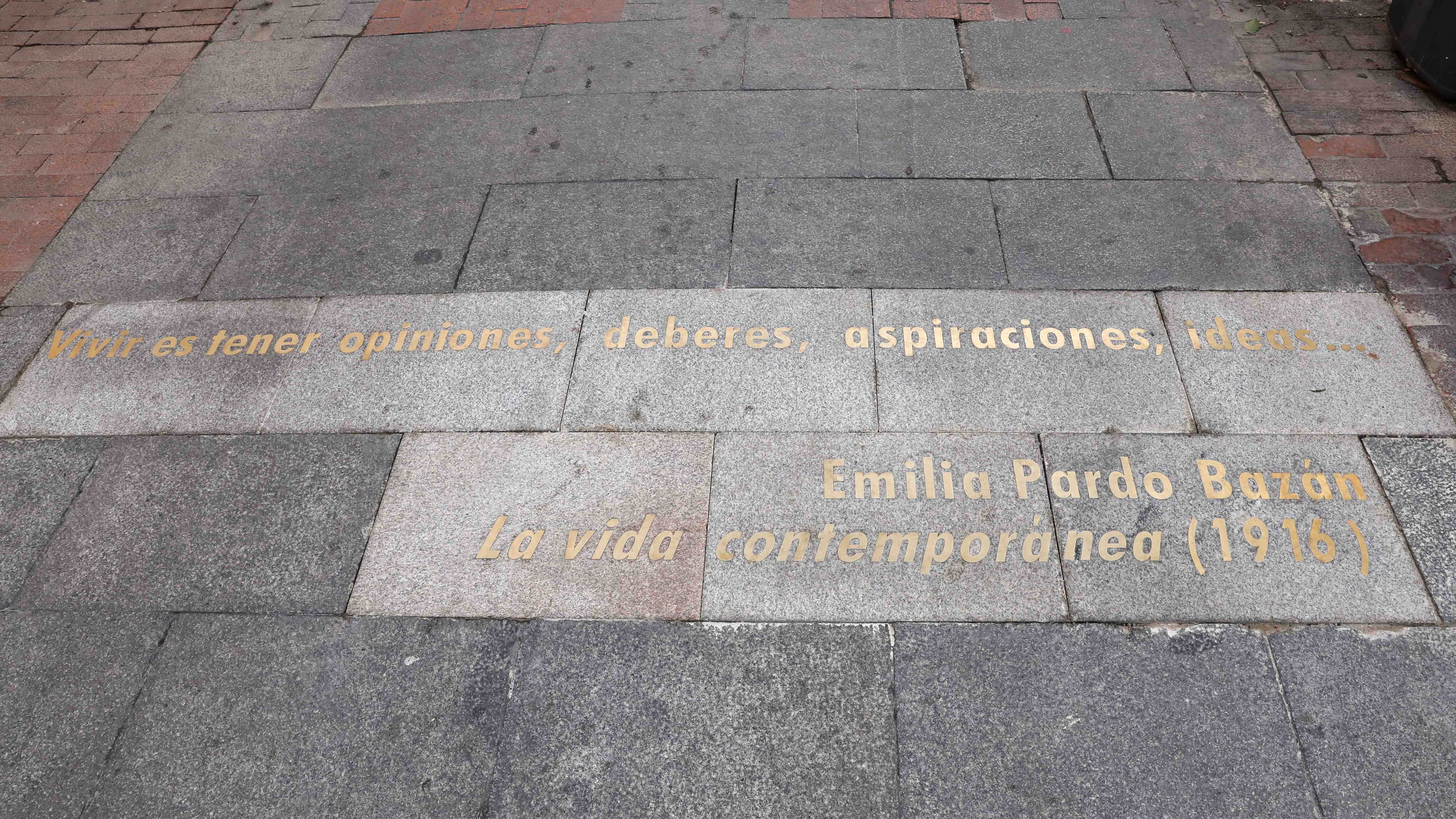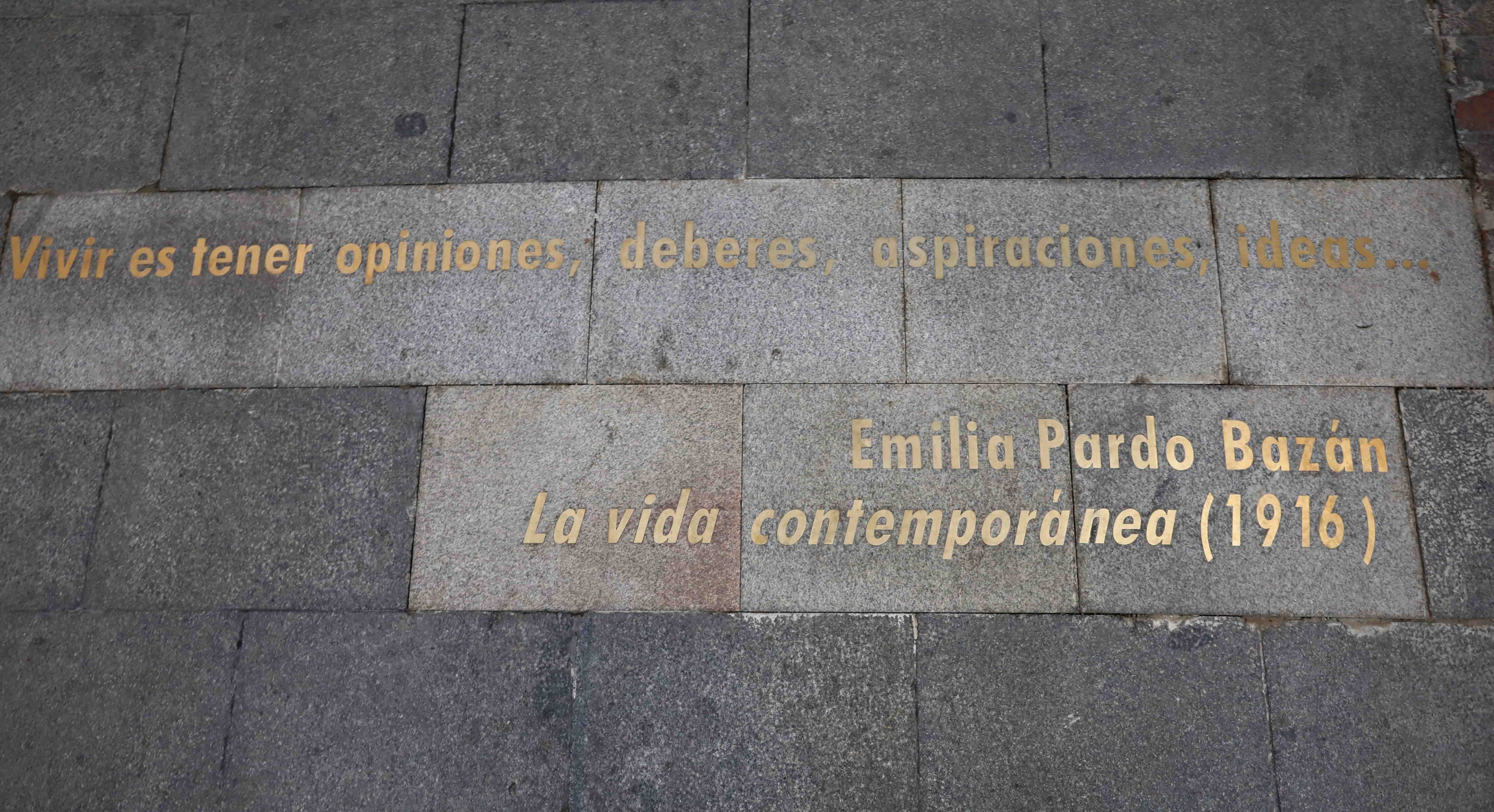 - La colocación de la frase en el pavimento precede a la instalación de un panel vertical informativo para divulgar entre los visitantes la vida y obra de Emilia Pardo Bazán