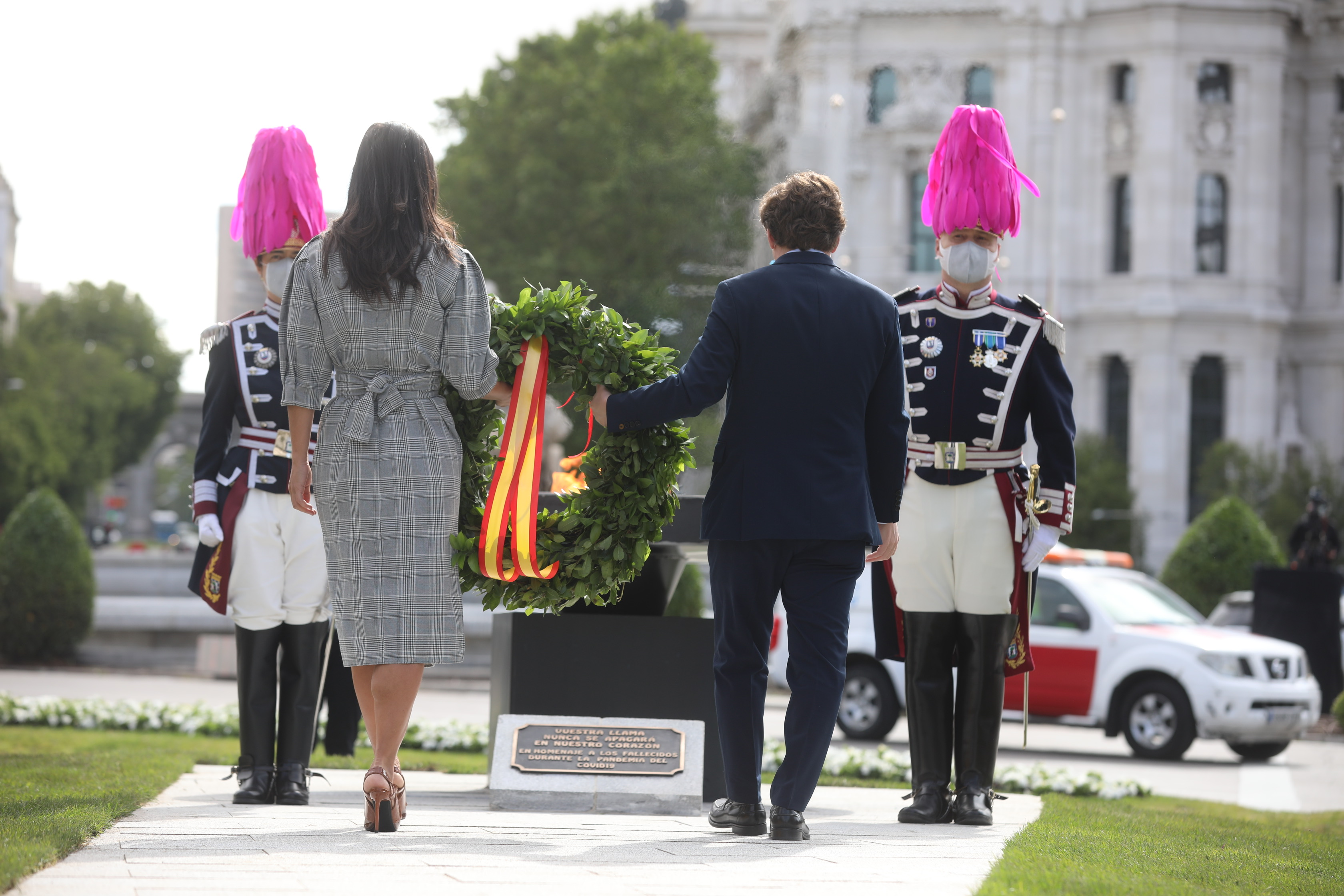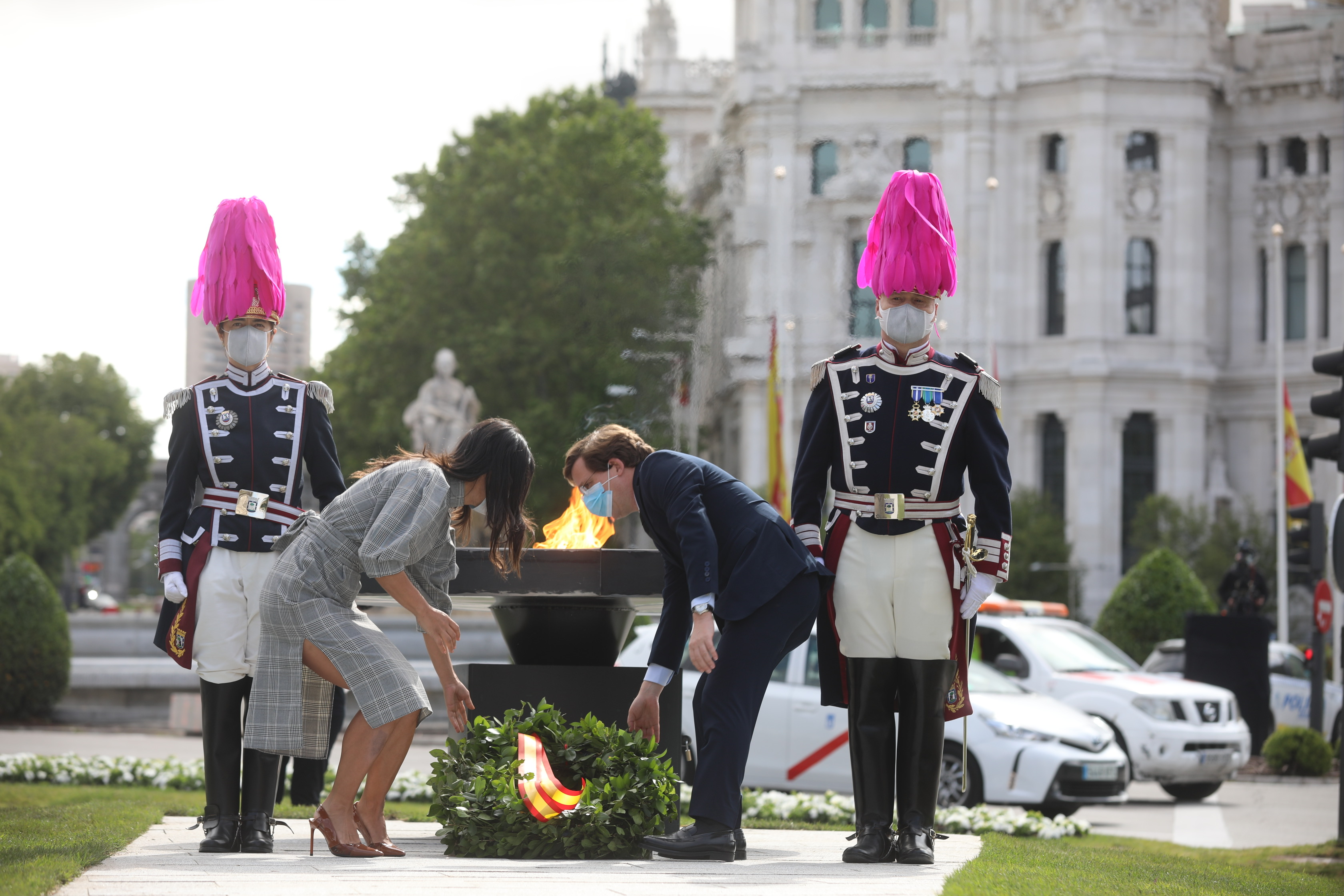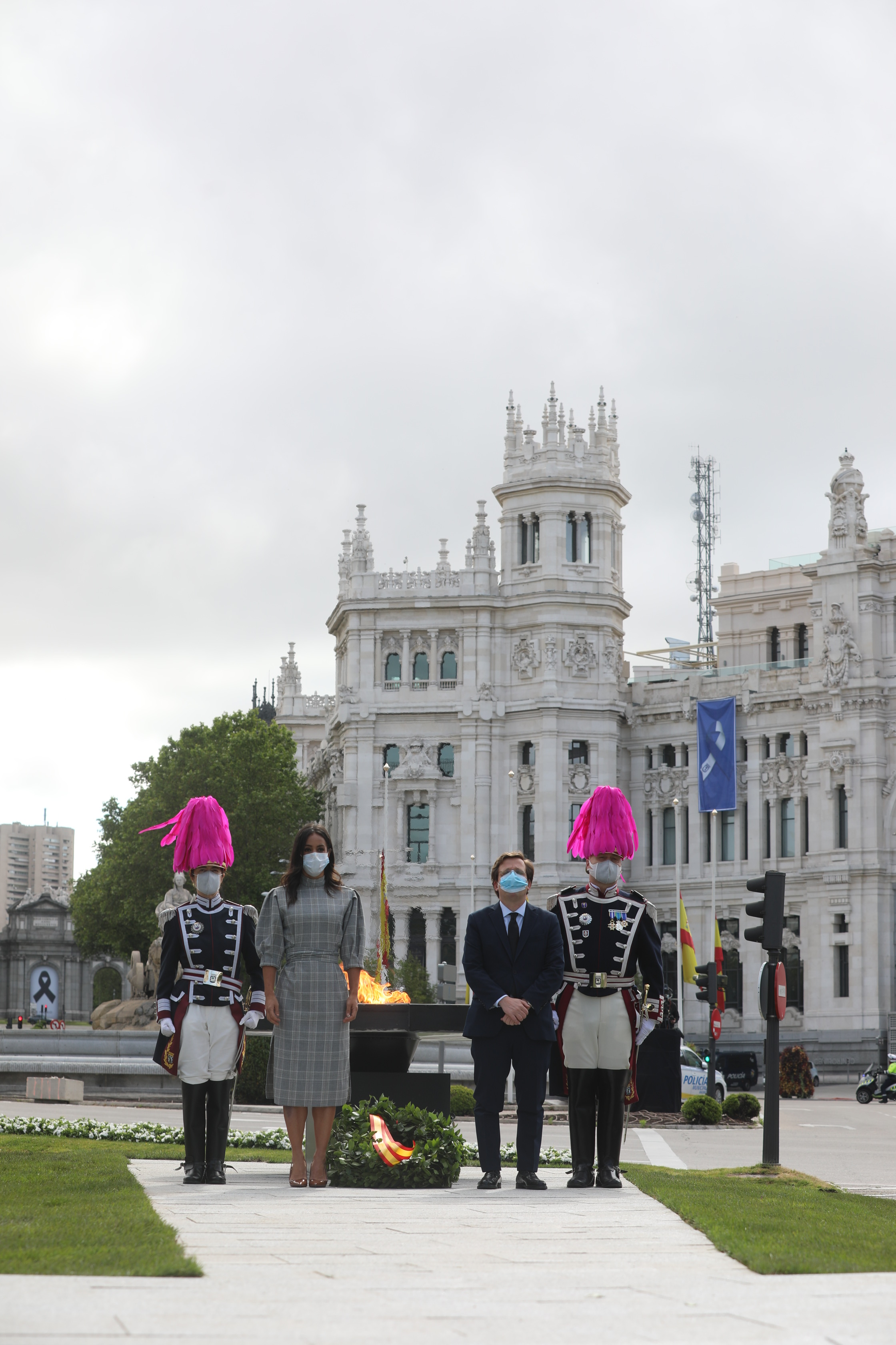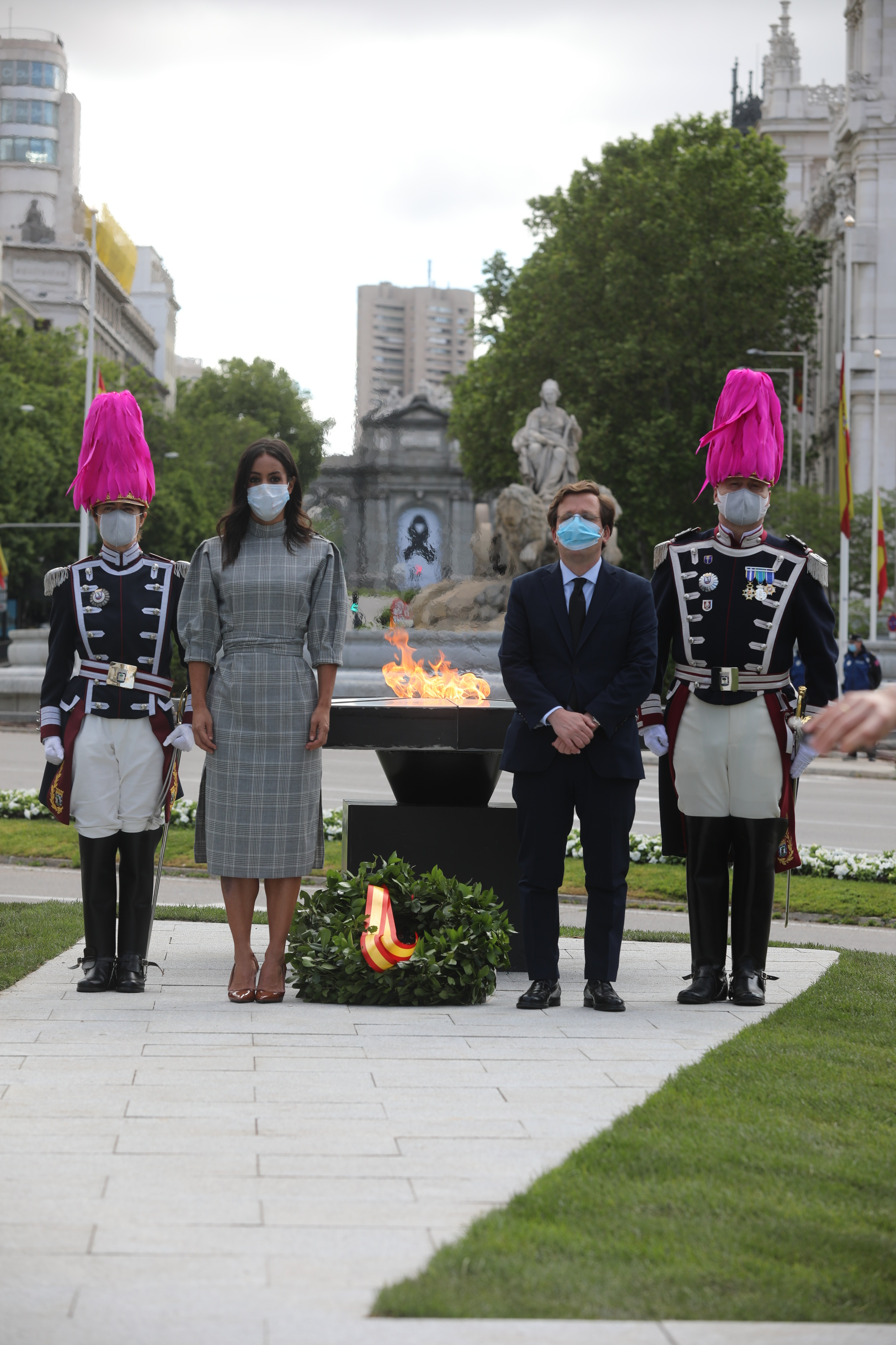 El alcalde de Madrid, José Luis Martínez-Almeida, acompañado por la vicealcaldesa de la ciudad, Begoña Villacís, y por los portavoces de todos los grupos municipales en el Ayuntamiento, ha inaugurado esta mañana un pebetero en la emblemática plaza de Cibeles que servirá de homenaje permanente a las víctimas de la COVID-19.